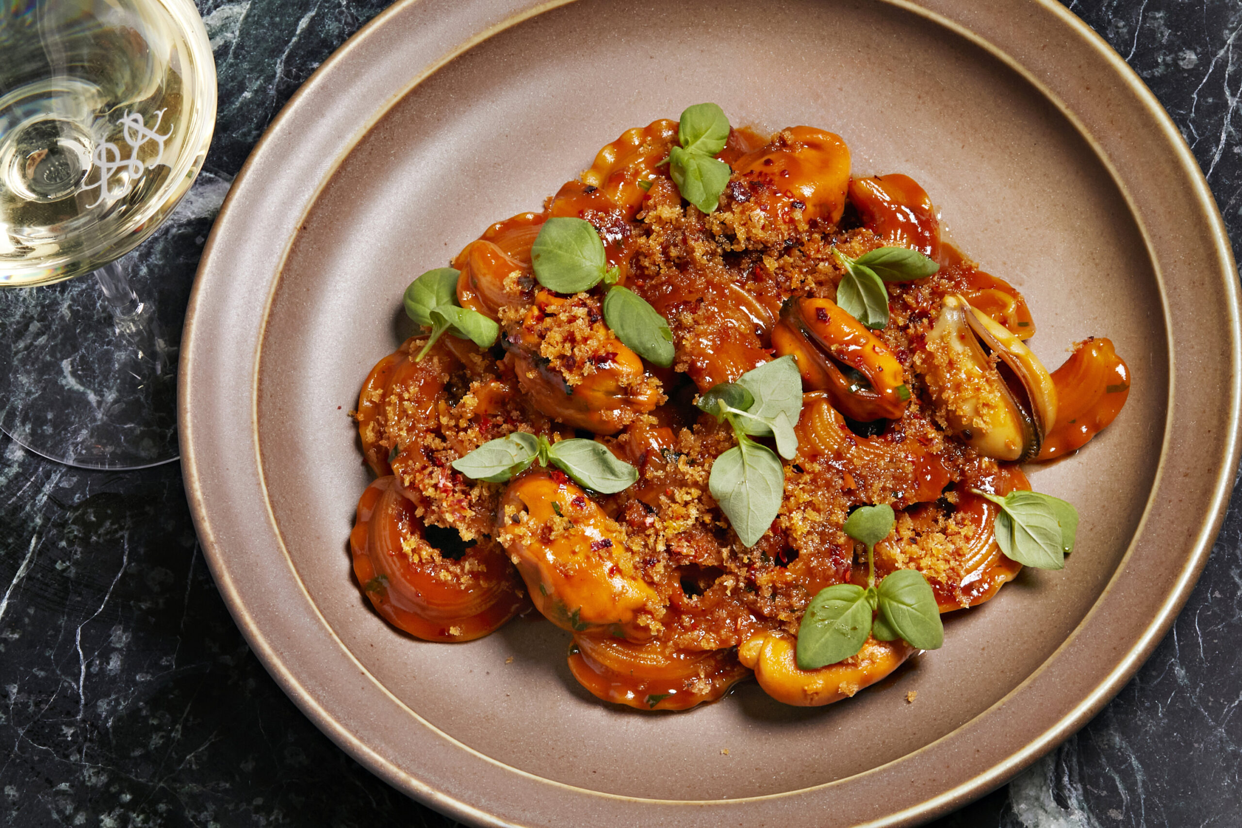 Pasta with Maine mussels and a glass of wine at Maison. Photograph by Deb Lindsey.