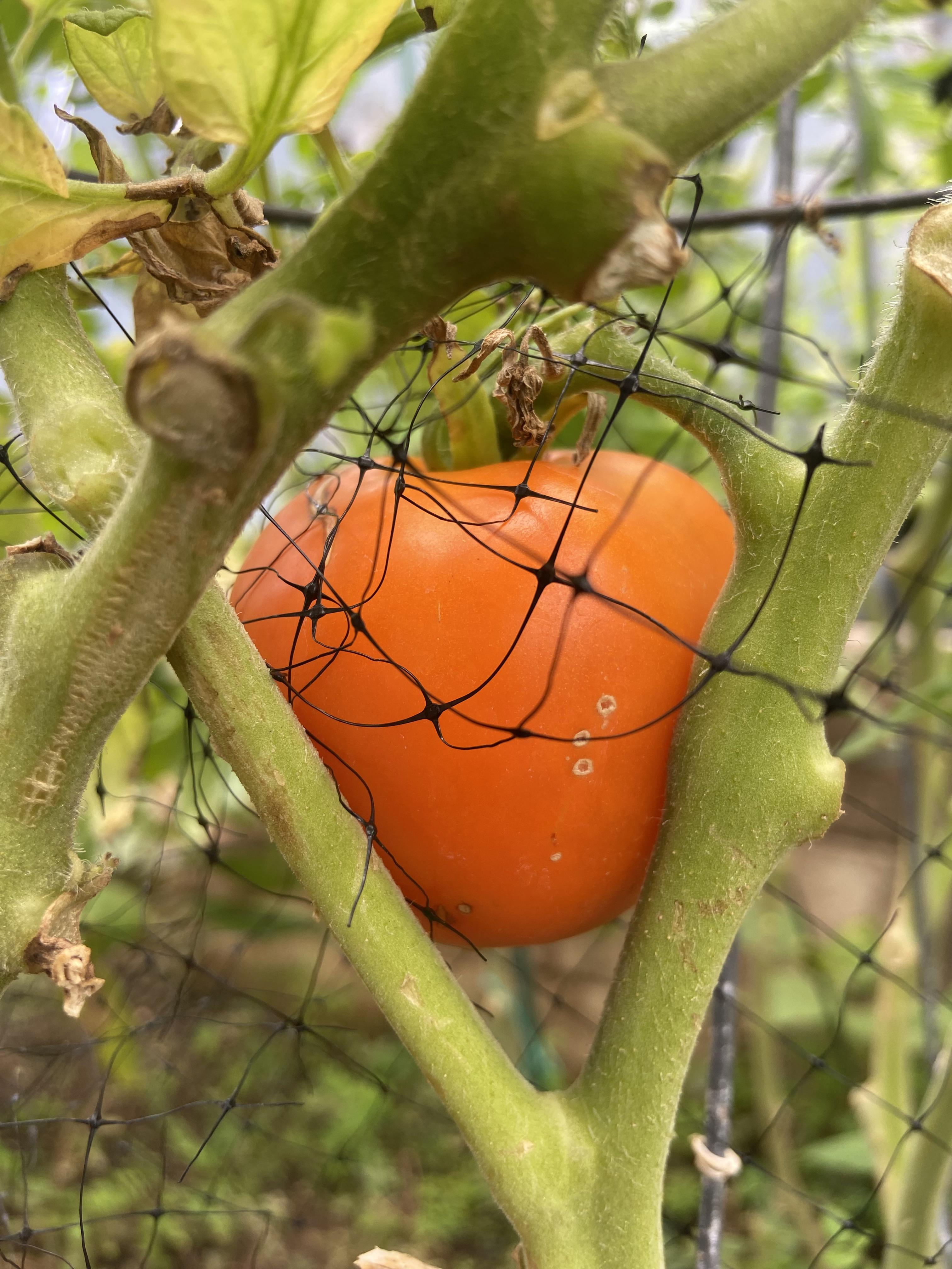Some tomatoes are orange! You can pick them when you see the very first blush of color and let them ripen on your counter. This one is almost over ripe, pick it now!