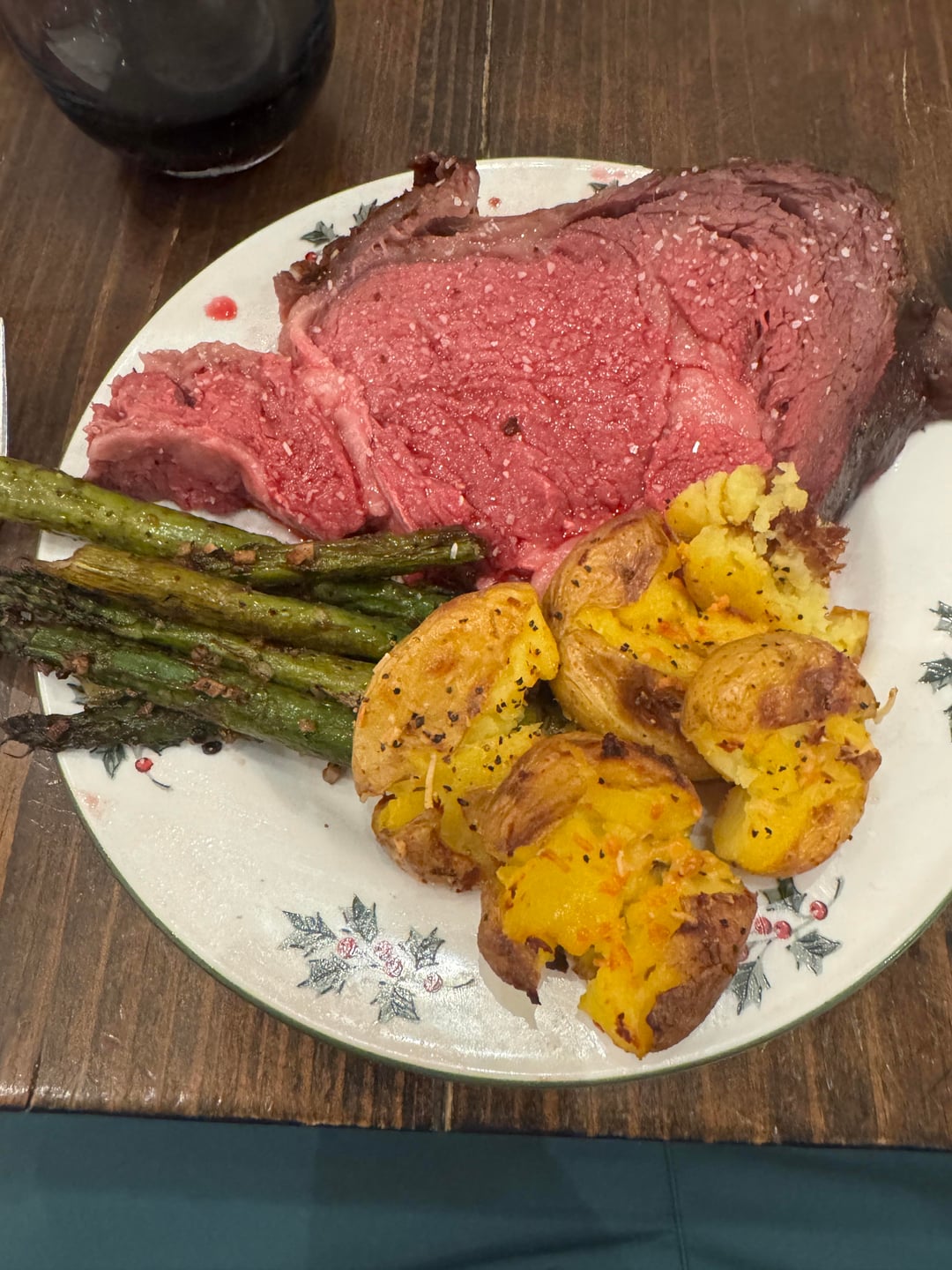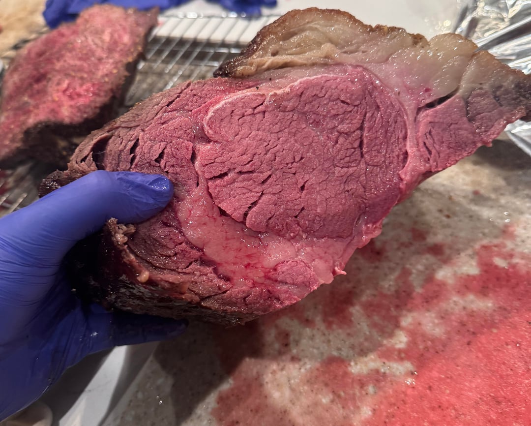 Dry aged/brined in the fridge for 6 days because I bought it too early, was on sale while I was doing other stuff and didn’t want to freeze it. 200 in the oven until it was 110 then seared it on the blackstone. Didn’t get quite as long a rest as I would’ve liked due to time pressure. It ate really good for $5.77 a pound! Simple SPG and butter for seasoning. It was 11 pounds with the bones. I’m 100% doing the salt and dry brine on all of these in the future, was my first time trying that. Probably take my next one to 113-115 before searing it. This one seemed closer to rare then medium rare especially in the middle. Idk, you guys tell me what you think!