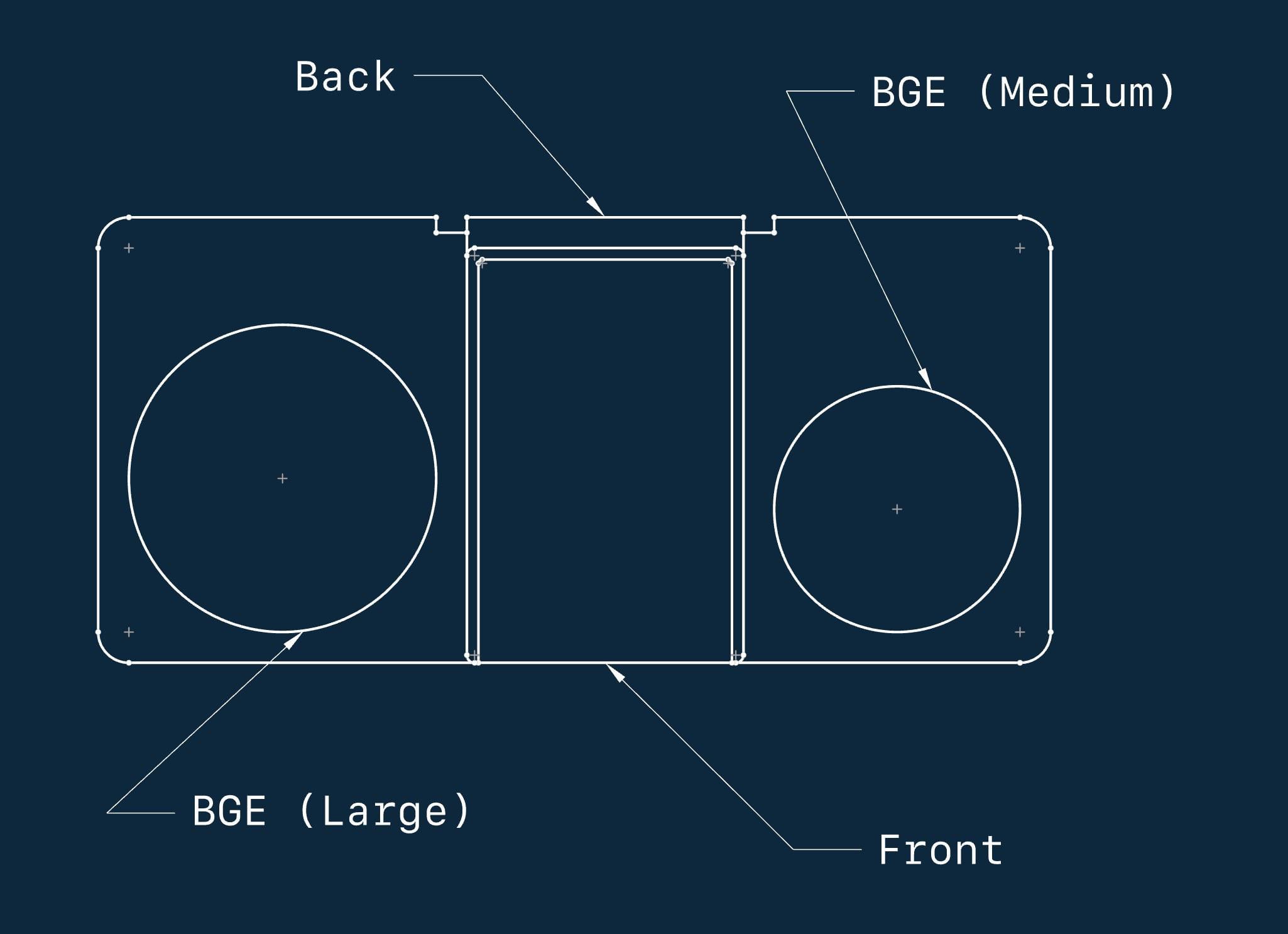 I’ve got two BGEs, a large and a medium, and I love the cooking workflow they allow. I’m designing a single table to hold both of them. This is a rough top-down view.