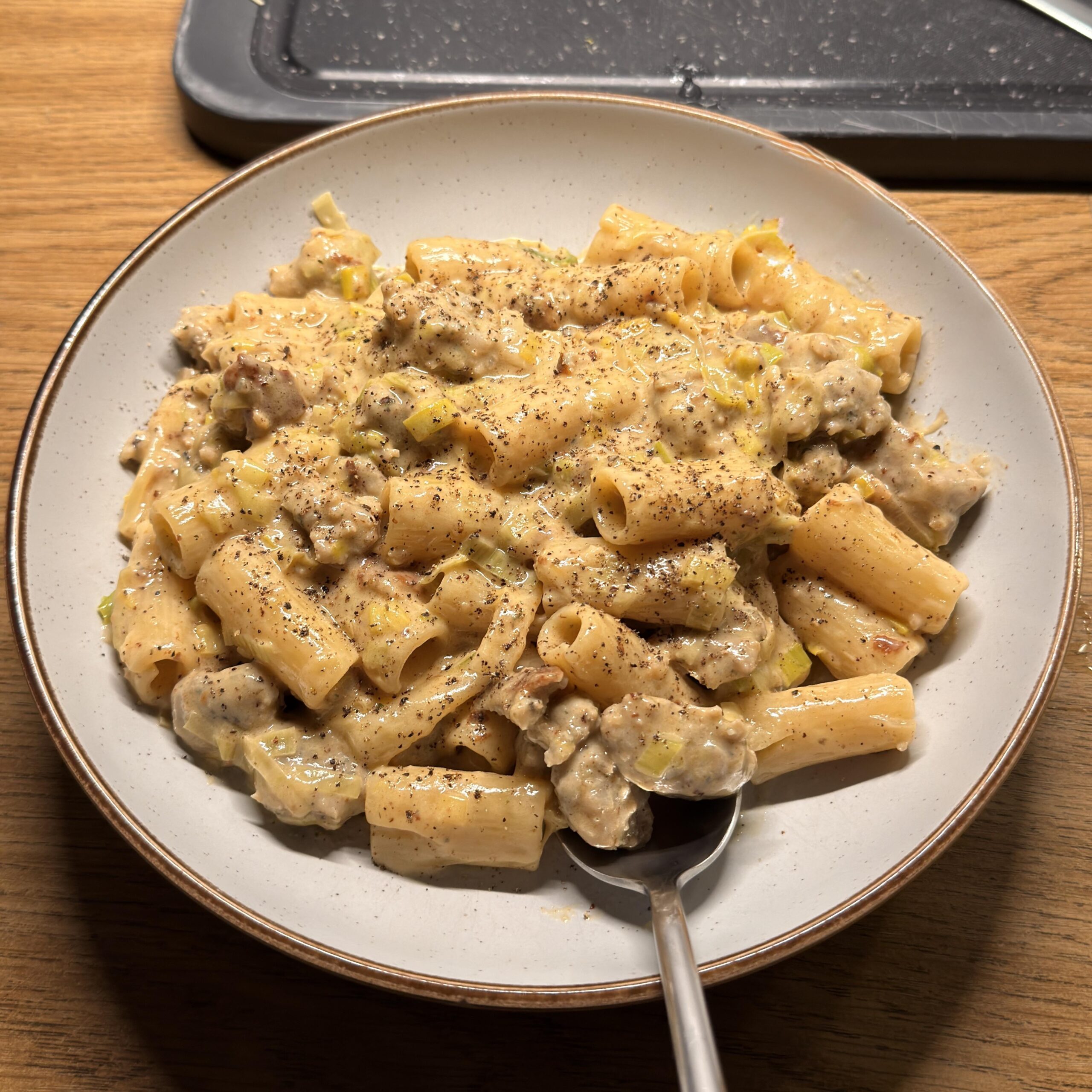 Sausage and leek wrapped in creamy rigatoni perfection.