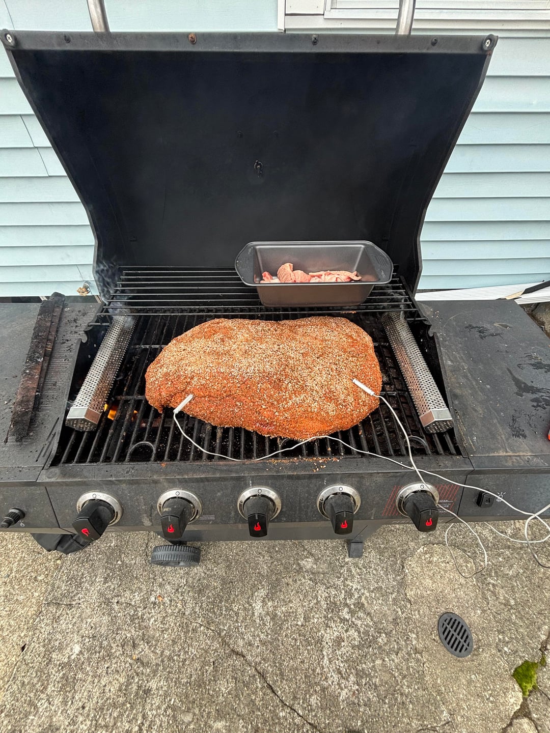 4- Water pan under grill. Lit only one burner on low. Filled both pellet tubes w/ hickory and placed them on each side of the brisket. 2 probes. One in the point and the other in the flat. Grill temp kept around 250°