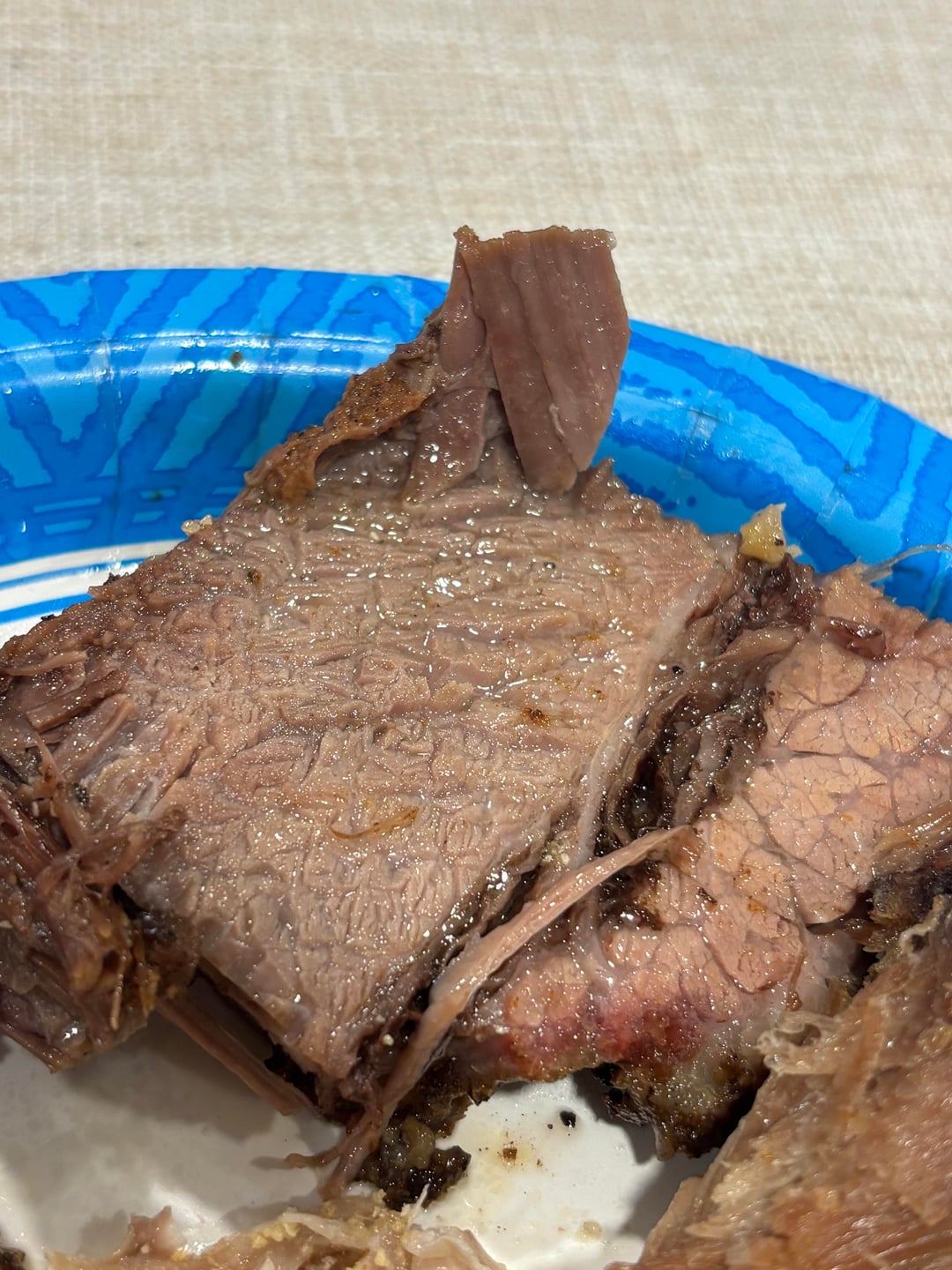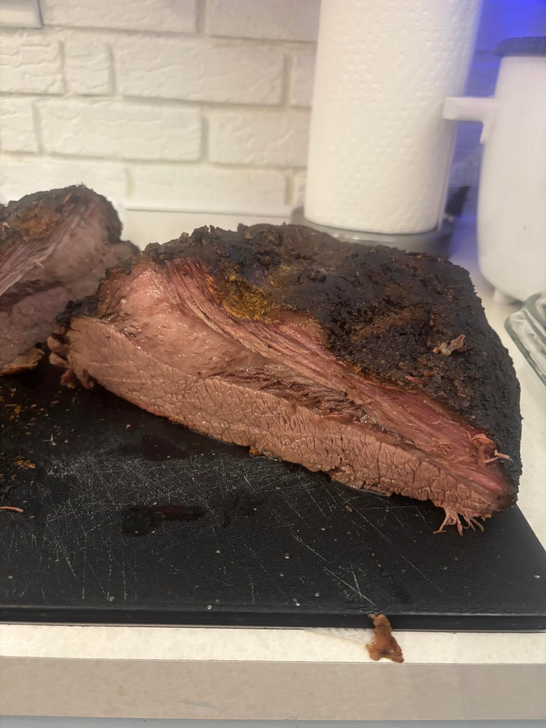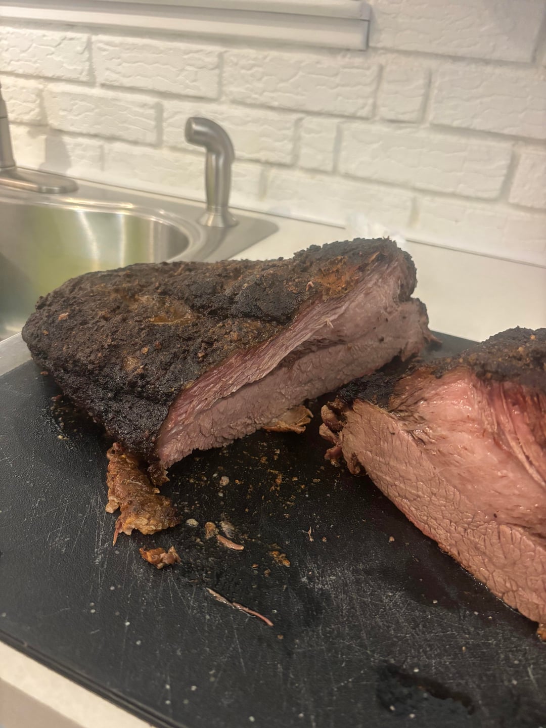 13- Unwrapped around 6pm and sliced right away. Lots of steam came out. Super tender, like almost falling apart tender. Not much of a smoke ring and I could taste some smoke but definitely not like an offset smoker. It smelled amazing and everyone was super happy with the results.