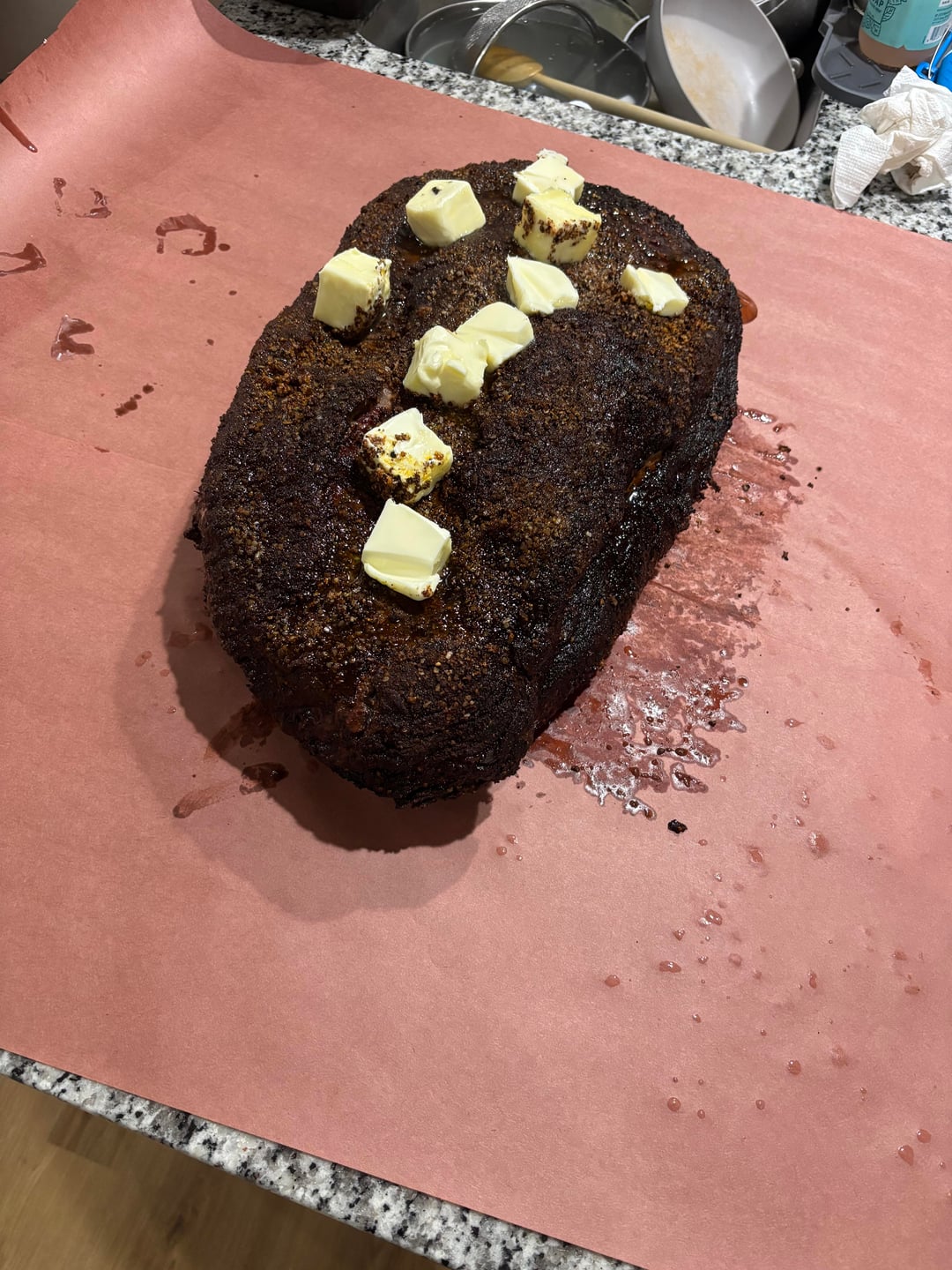 8- Pulled and wrapped in butcher paper at 6:30pm around 140°. Used butter and the rendered fat.