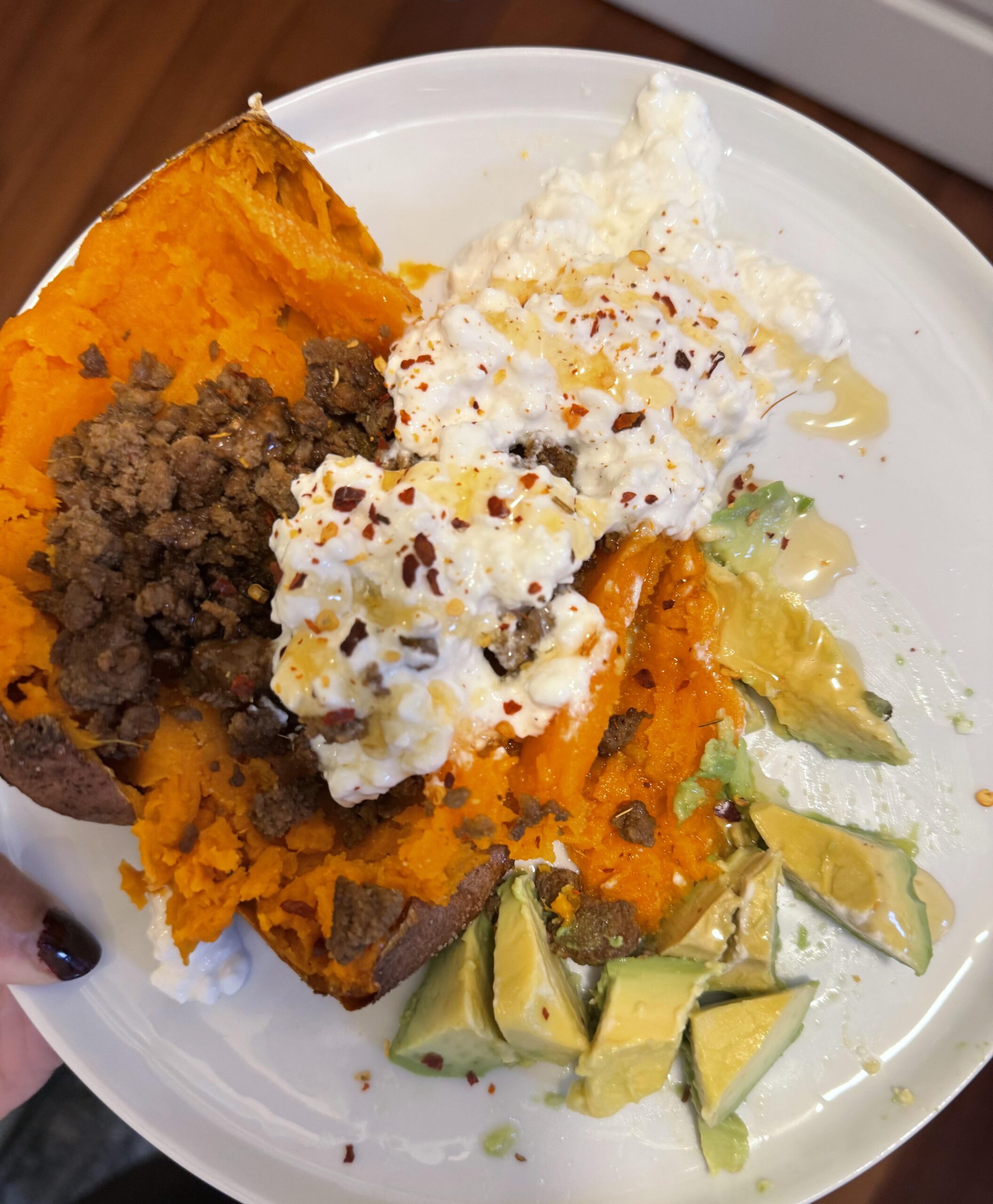 Sautéed beef with sorta taco seasoning, air fried sweet potato, cottage cheese, avocado, drizzle of honey and red chili flakes