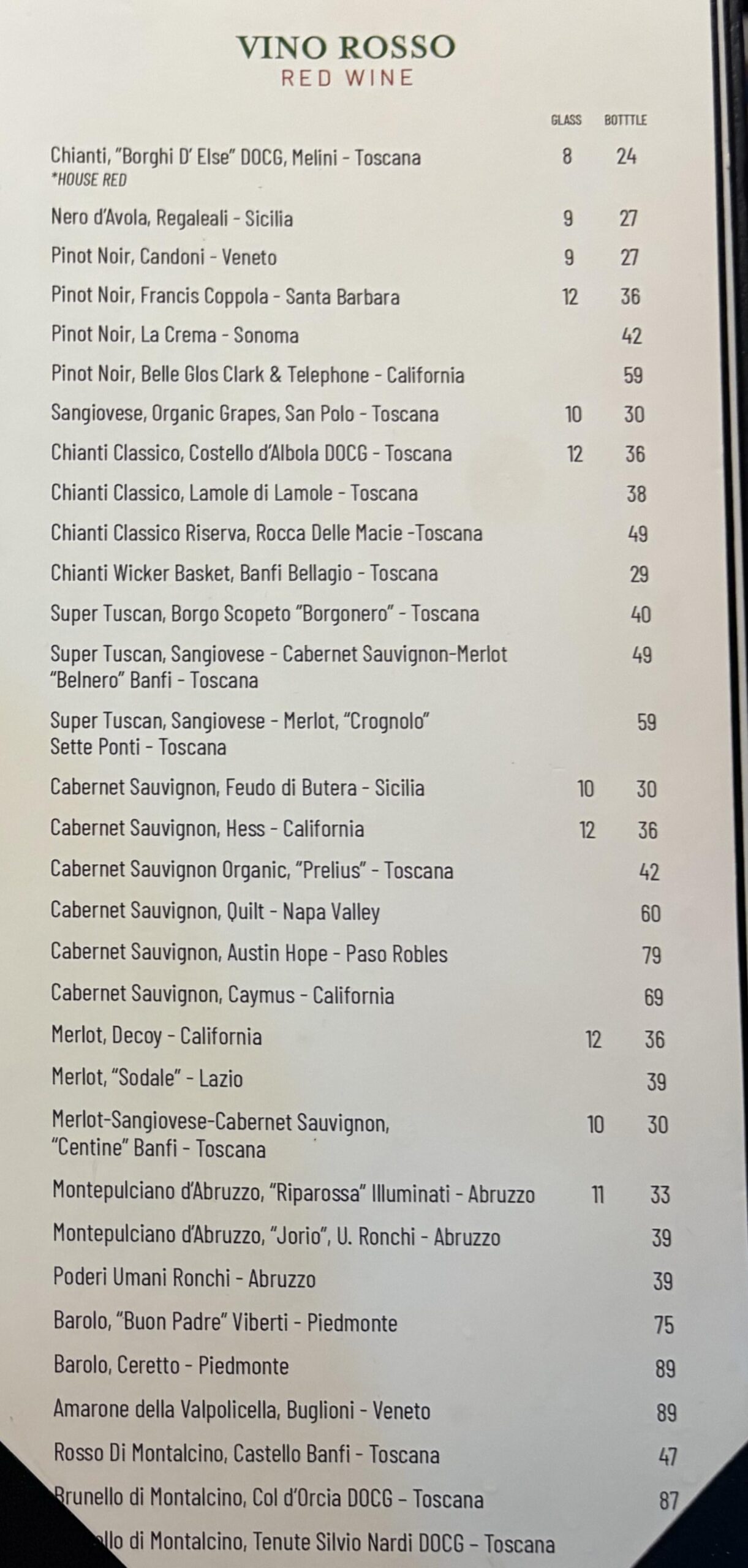 This is the wine menu for our local Italian restaurant. I don’t have much experience with Italian wine, so I was hoping you all could tell me what I should be drinking?