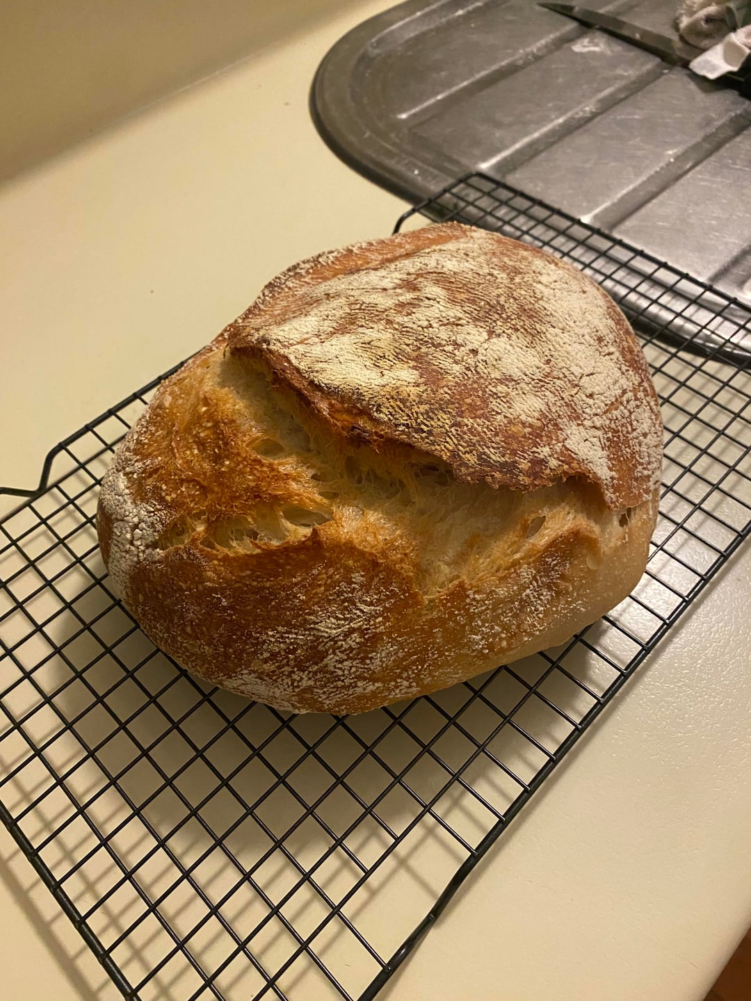 The cut that allows excess steam to escape. I use an exceptionally sharp kitchen knife, but if you want to get into this properly, start hinting about a “scoring knife” as a gift from your SO. It is basically an old school razor blade holder, a cheap gift you will keep forever.