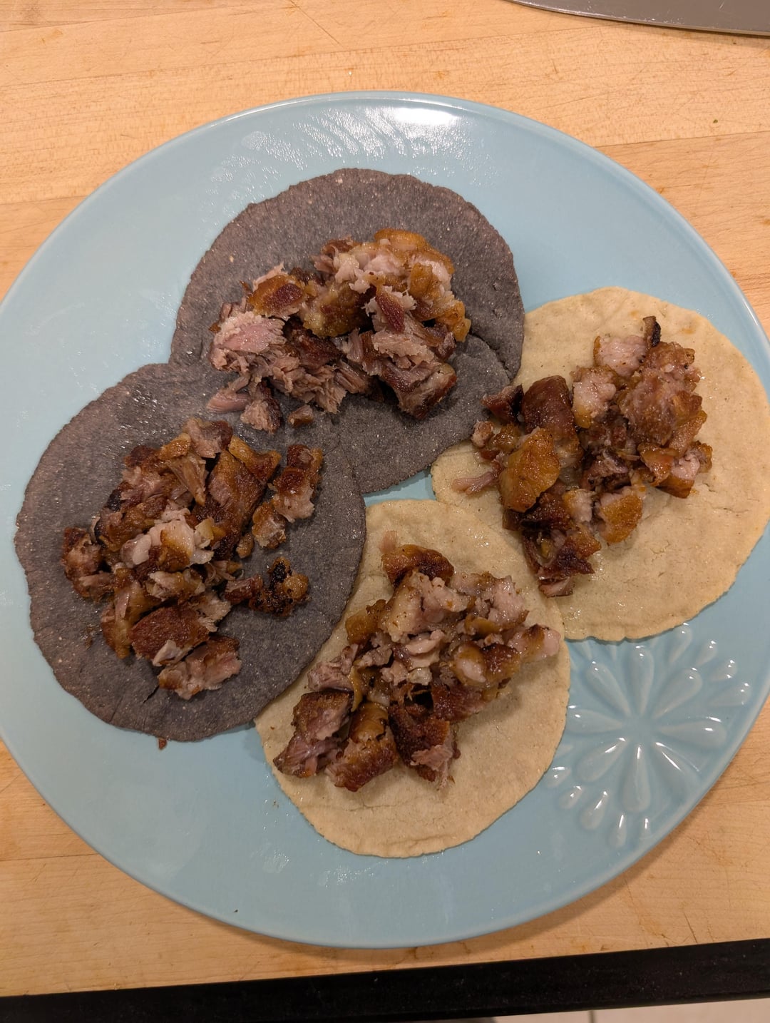 Pork shoulder steak cooked low in manteca for a few hours and then crisped. Not the traditional way, but the results were great. Homemade salsa verde and tortillas.