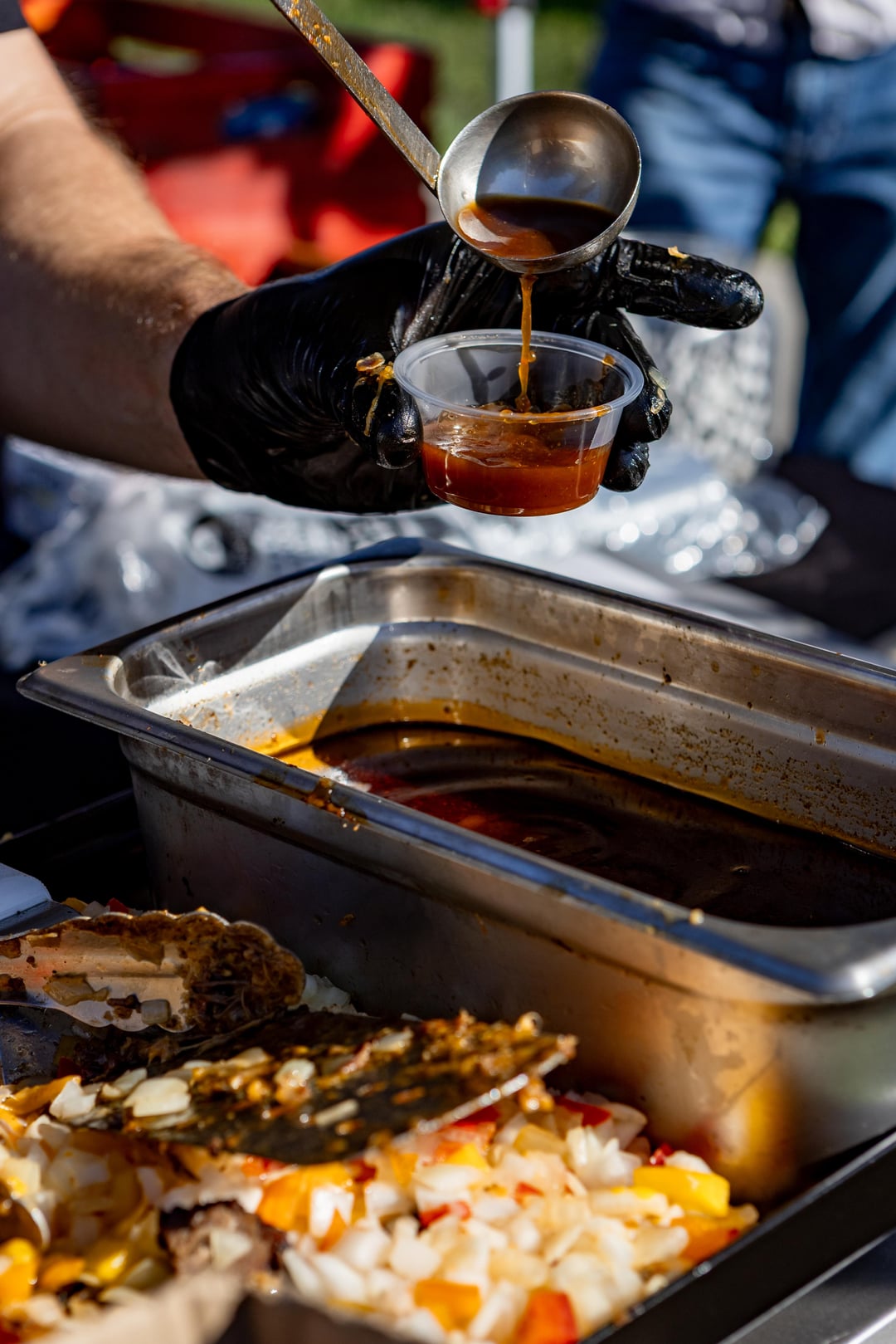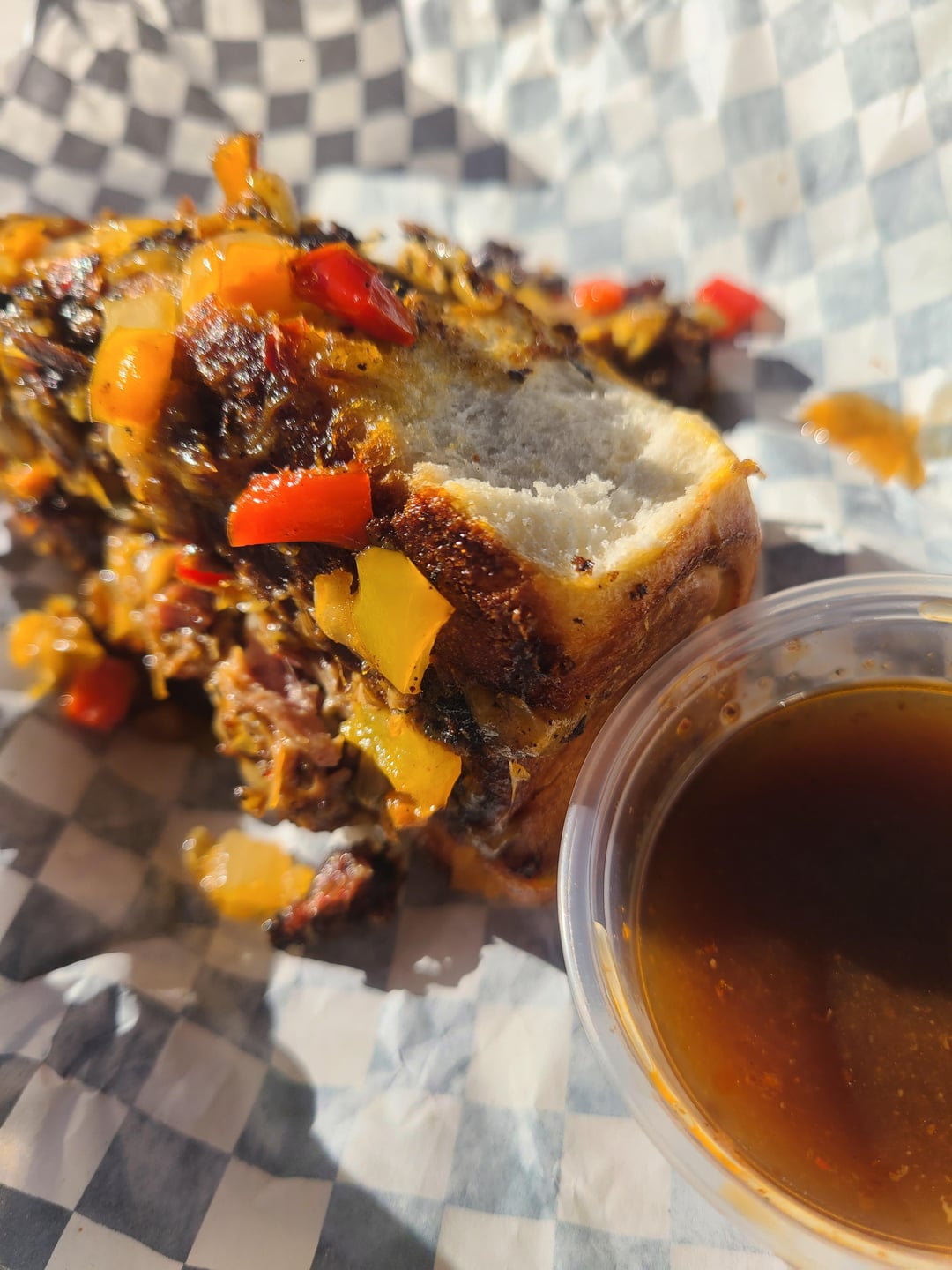 LA Cheesesteaks, smoked beef short rib, smoked and confit beef cheeks, onions, bell peppers, garlic and cheddar cheese on freshly baked, handmade rolls, with a handmade beef jus for dipping – $10, or 2 for $18.