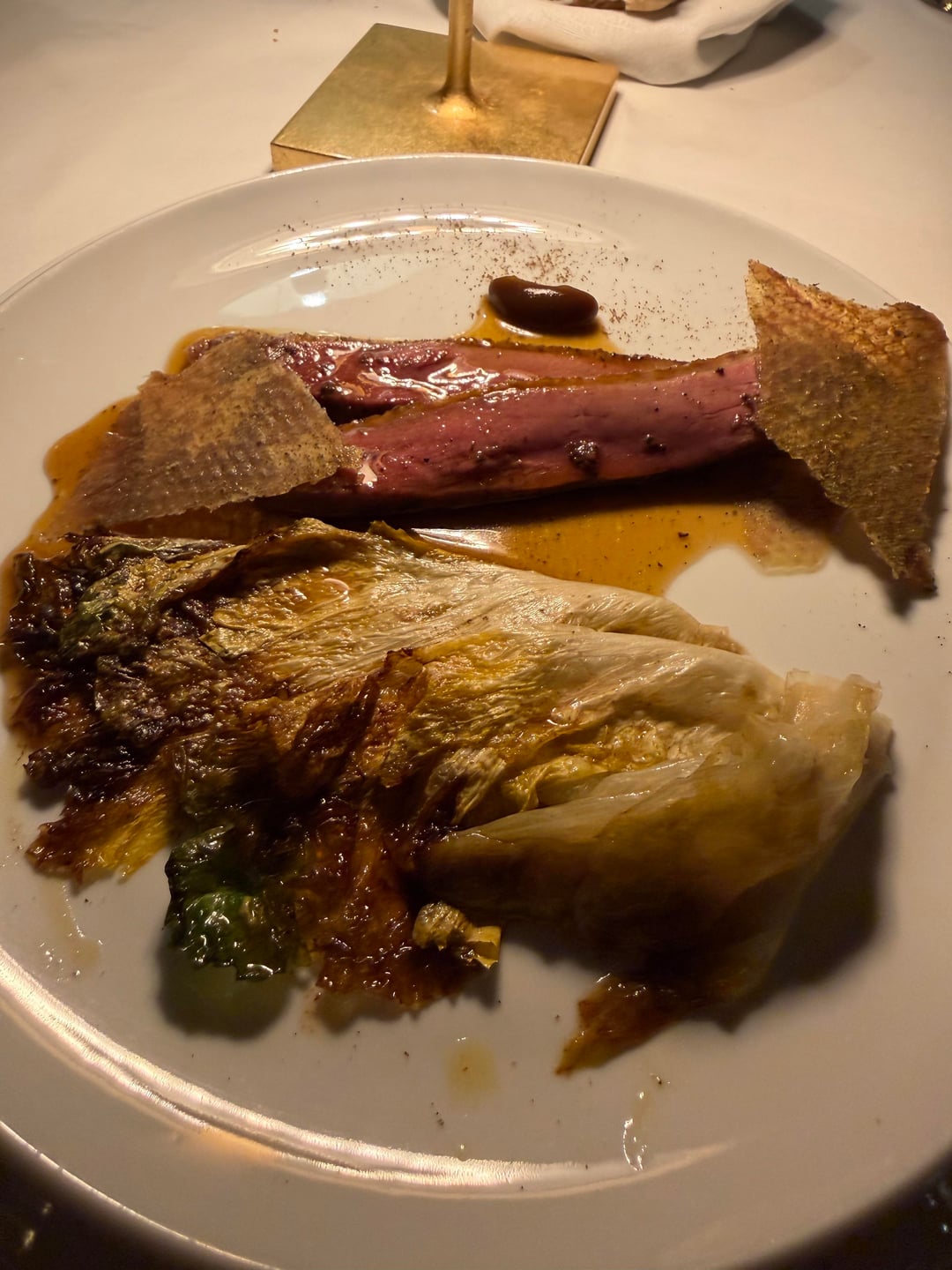 Duck – presentation before coming out was really cool. Haven't seen a presentation like this before with the skin laid out like that. Duck was very good. Crispy skin added a lot. Came with a super bitter vegetable.