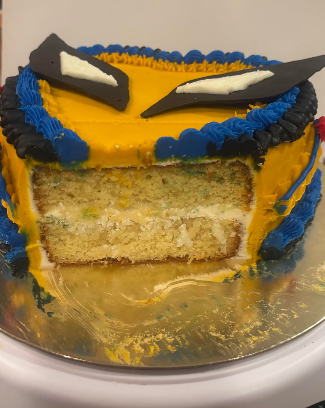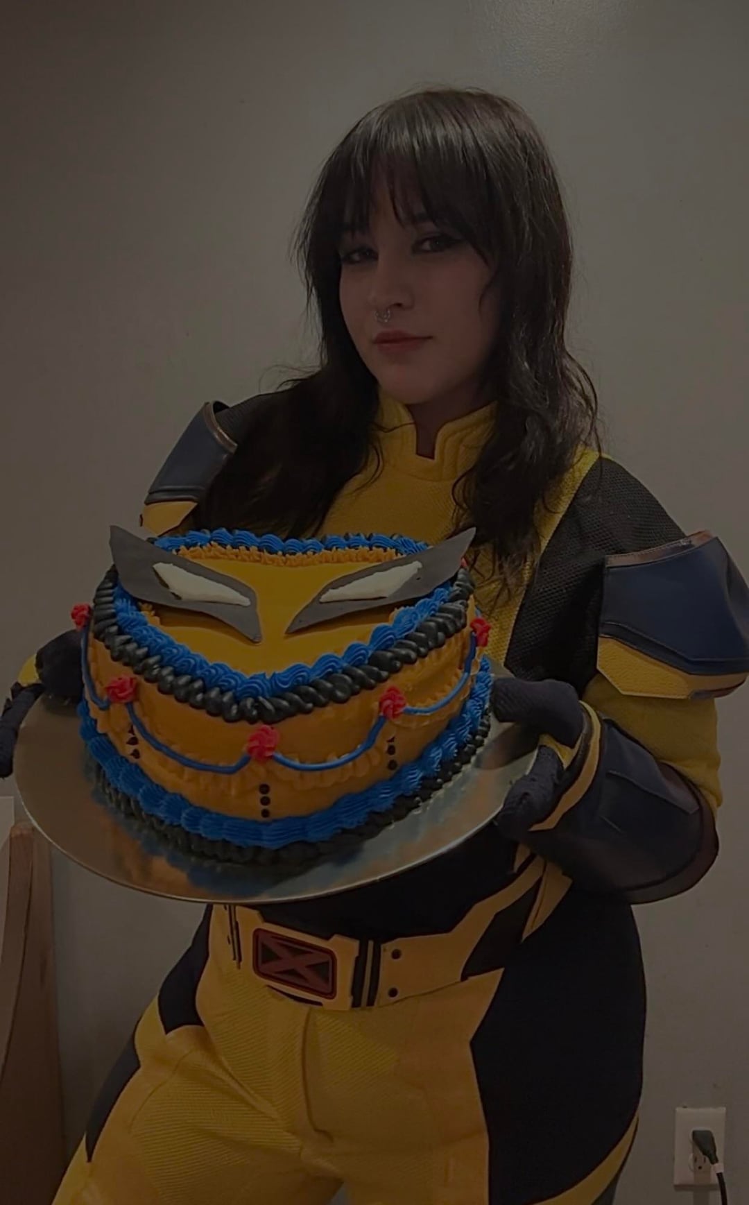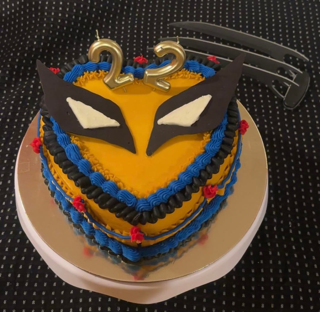 wolverine themed heart cake!! this was my first time doing a coconut cake,, i just kinda threw together what felt right and oml it was so smooth and had a delicate sweetness to it. best tasting of my cakes so far. i took a silly quit vid of me cutting it with my wolverine claws but this subreddit wont let me upload videos 💔