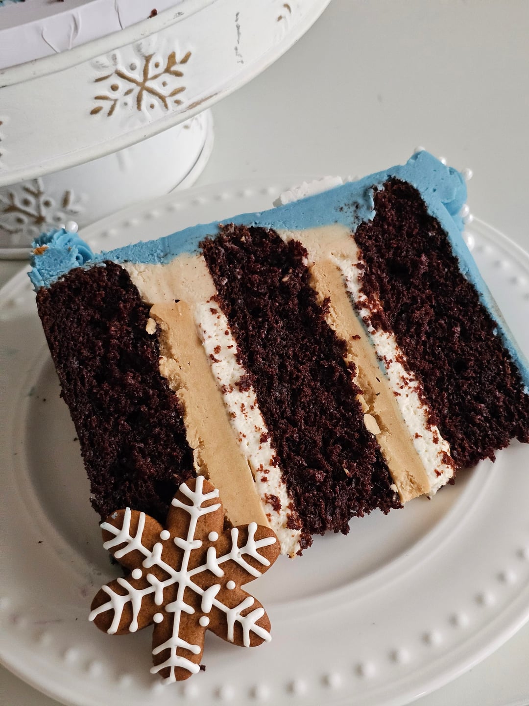 Chocolate cake with biscoff buttercream and cream cheese mousse filling. The gingerbread cookies were extras that I had made for something else.