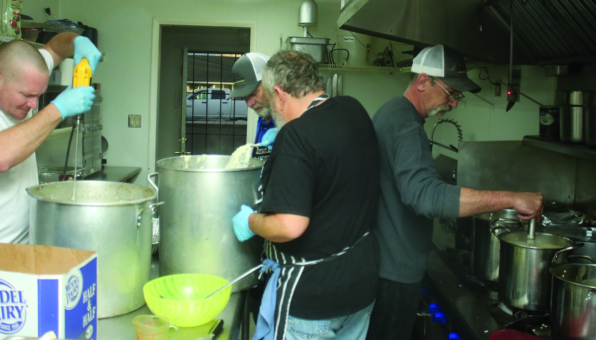 Cooks and helpers ensure the Christmas meal is ready on time. From left are Nathan Bracken, Alex Riddle, Sean Dougherty and Dan Peterson (black shirt).