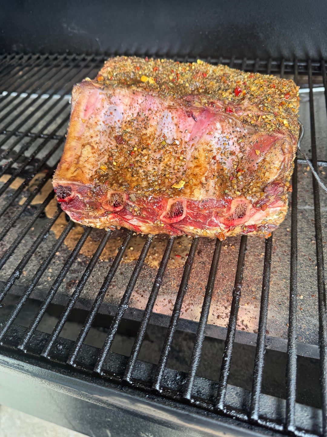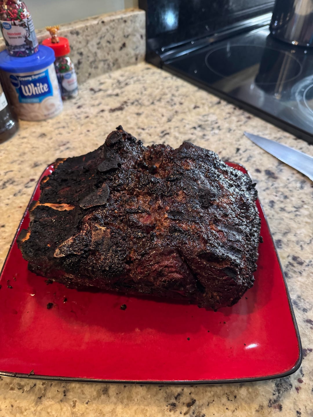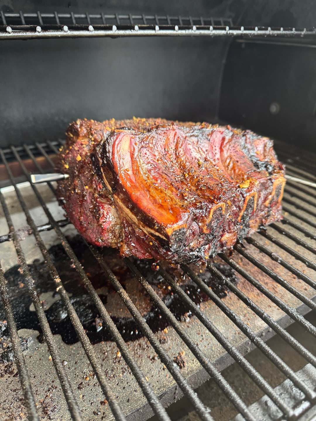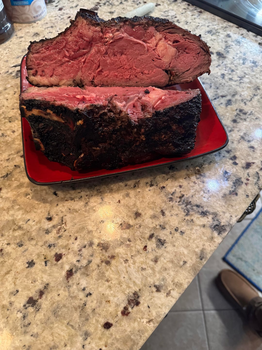 Apparently everyone smoked a prime rib this Christmas including me. 250 degrees for just over 2 hours. Pulled at 125 internal. Rested for about 5 hours and finished with a sear on my grill.