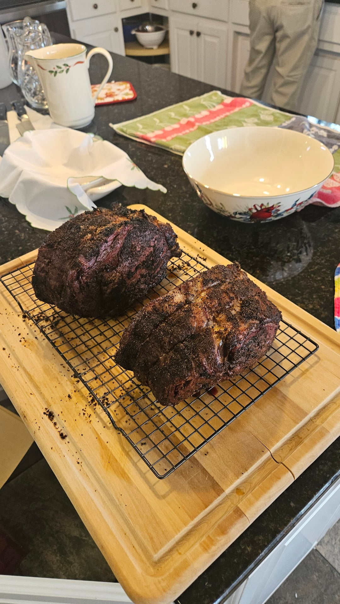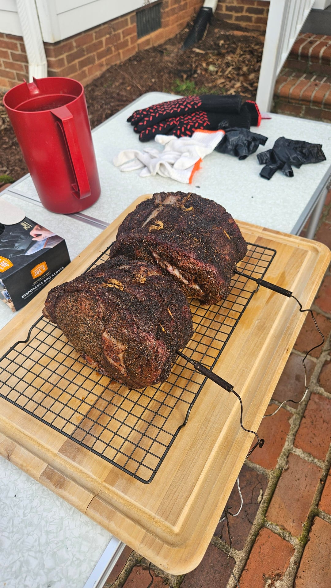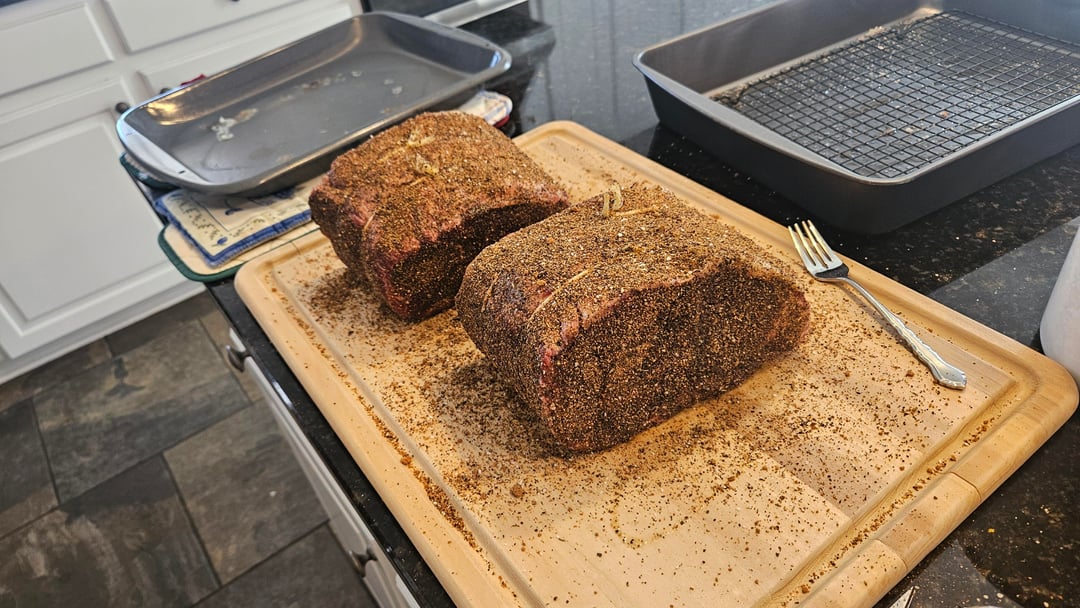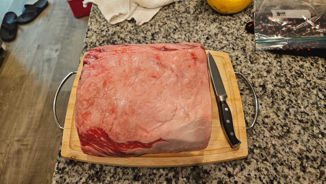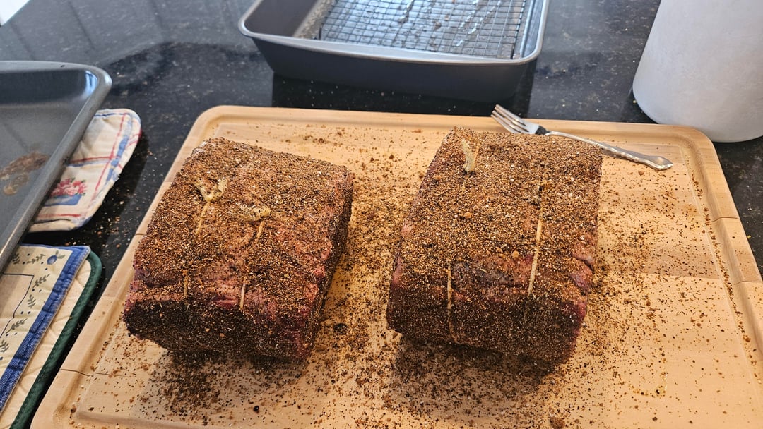 -8.7lb choice boneless from a local butcher -Cut in half and dry-brined around 40 hours -Homemade coffee rub -Smoked on WSM with pecan wood from tree knocked down during Heleneby BrickTamland77 2 Comments Silver-Surfer_000 1 month ago Looks very fine.. Ashamed_Bicycle2323 1 month ago Looks grubbin’ to me. What was the final temp?