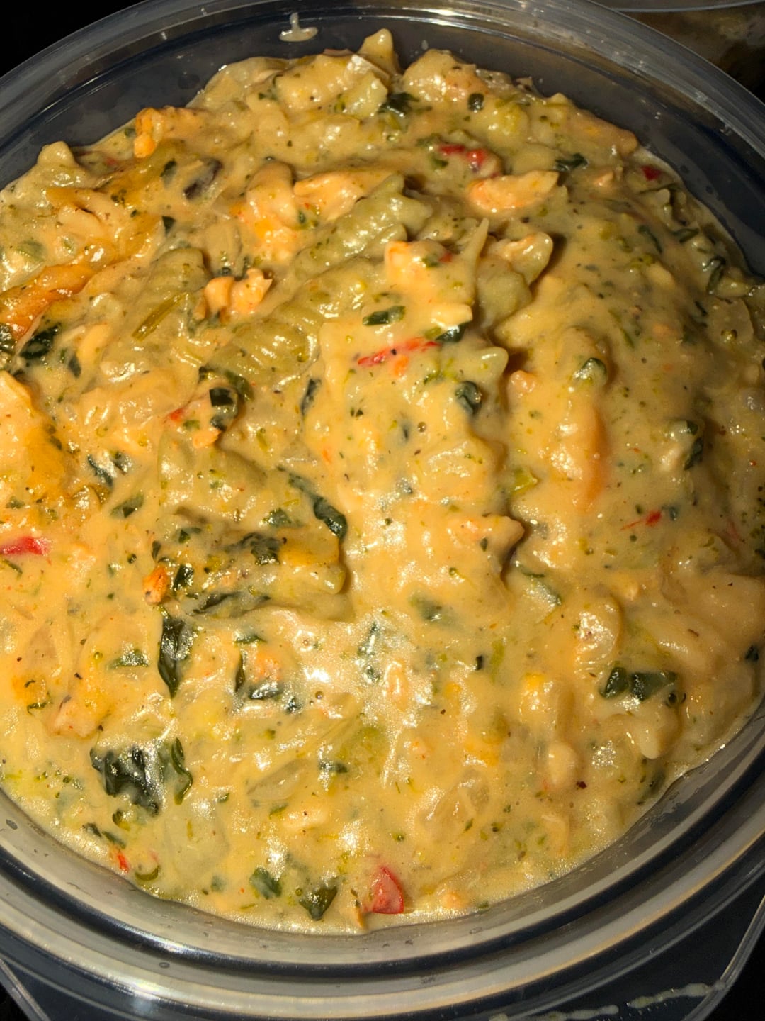 I’m seeing broccoli, spinach, onion, red peppers of some kind, some mushroom, cheese, pasta, cheese, and what *might* be chunks of chicken.