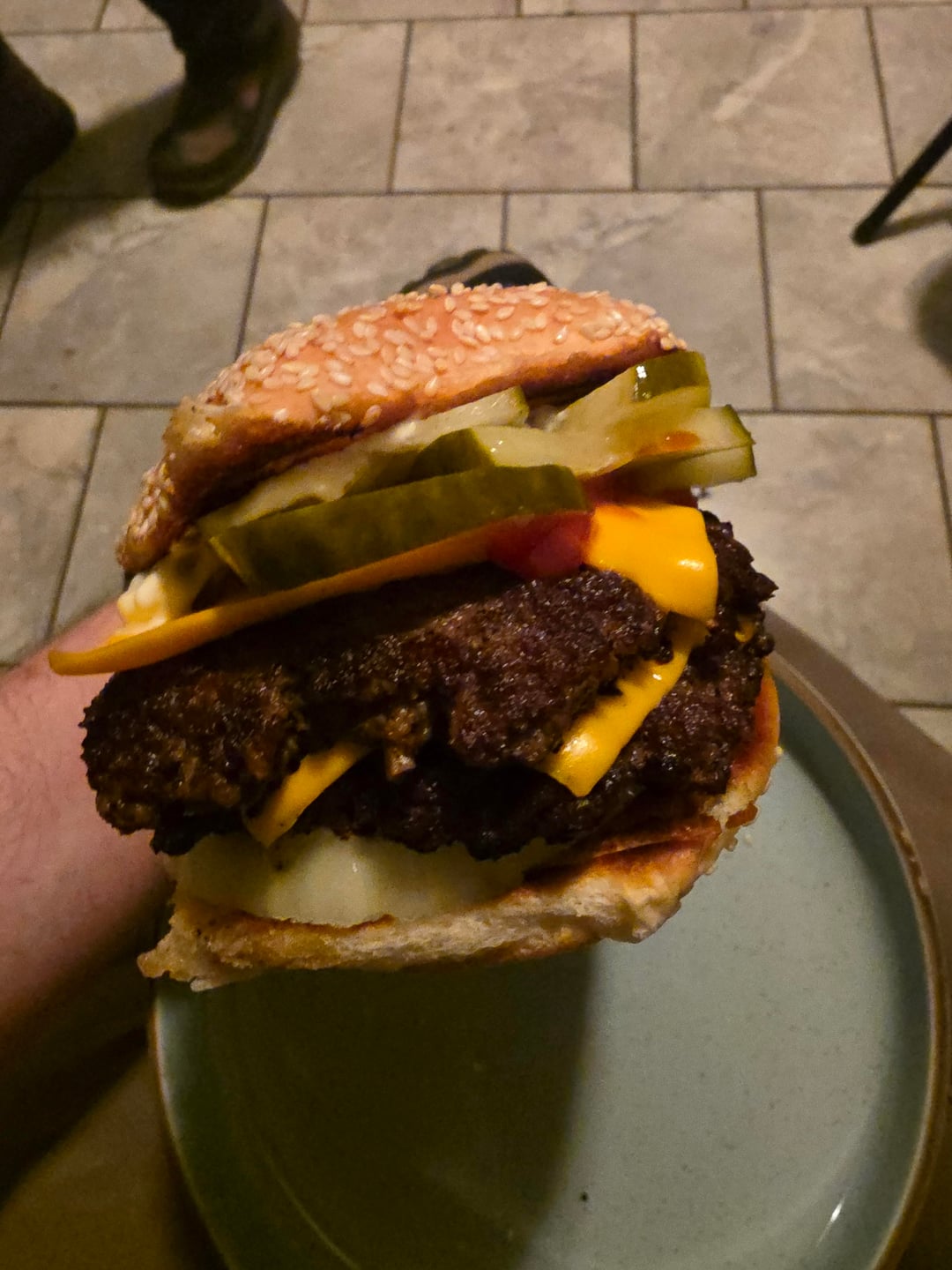 Unnecessarily large pile of pickles. Gargantuan chunk of onion. Cheese isn’t _melted_, and these patties aren’t _smashed,_ so much as just small.