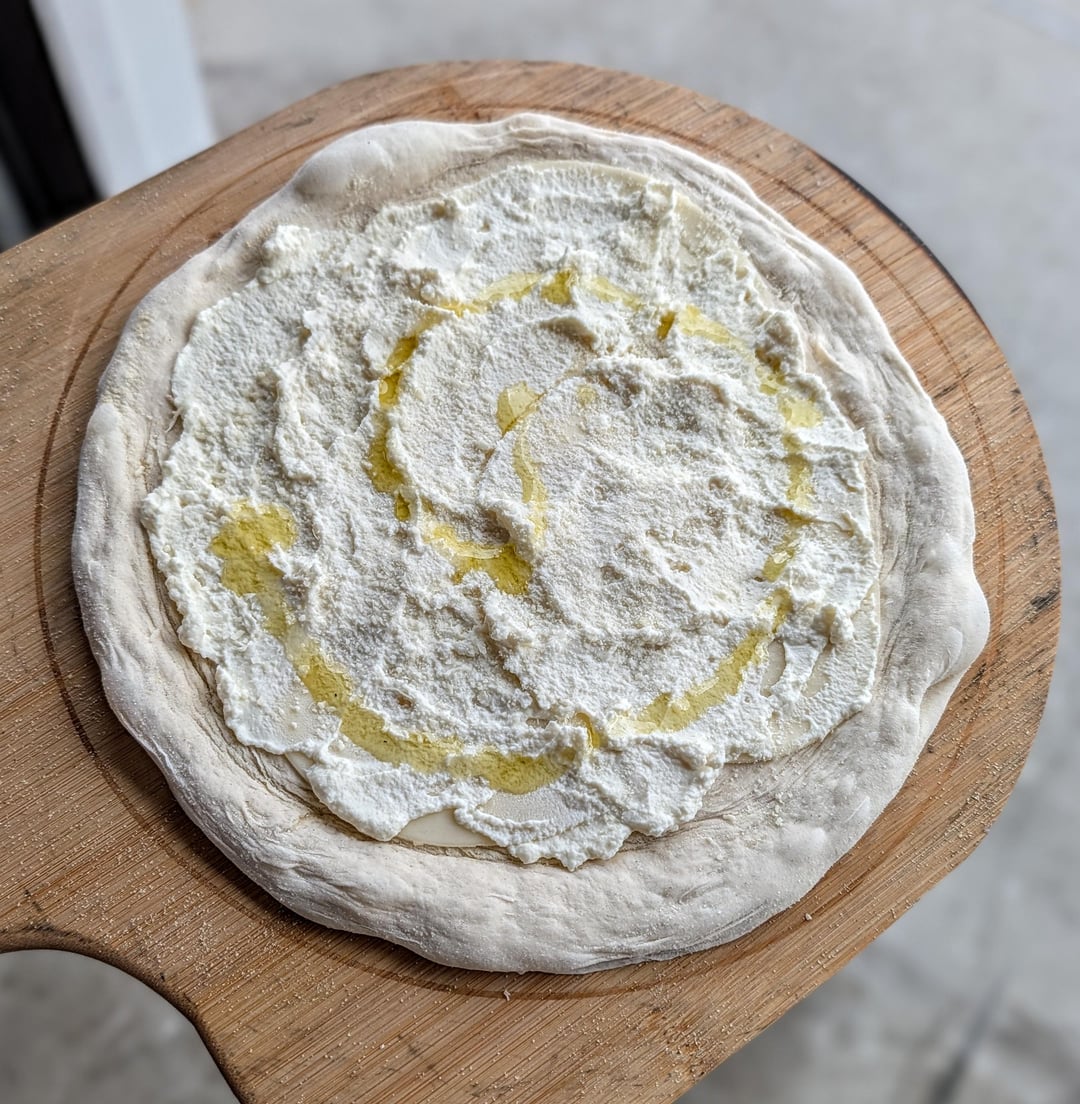 The white sauce looks amazing. Could you hook a pizza nerd up please. Ricotta then what. Looks like you can add it quite thick.