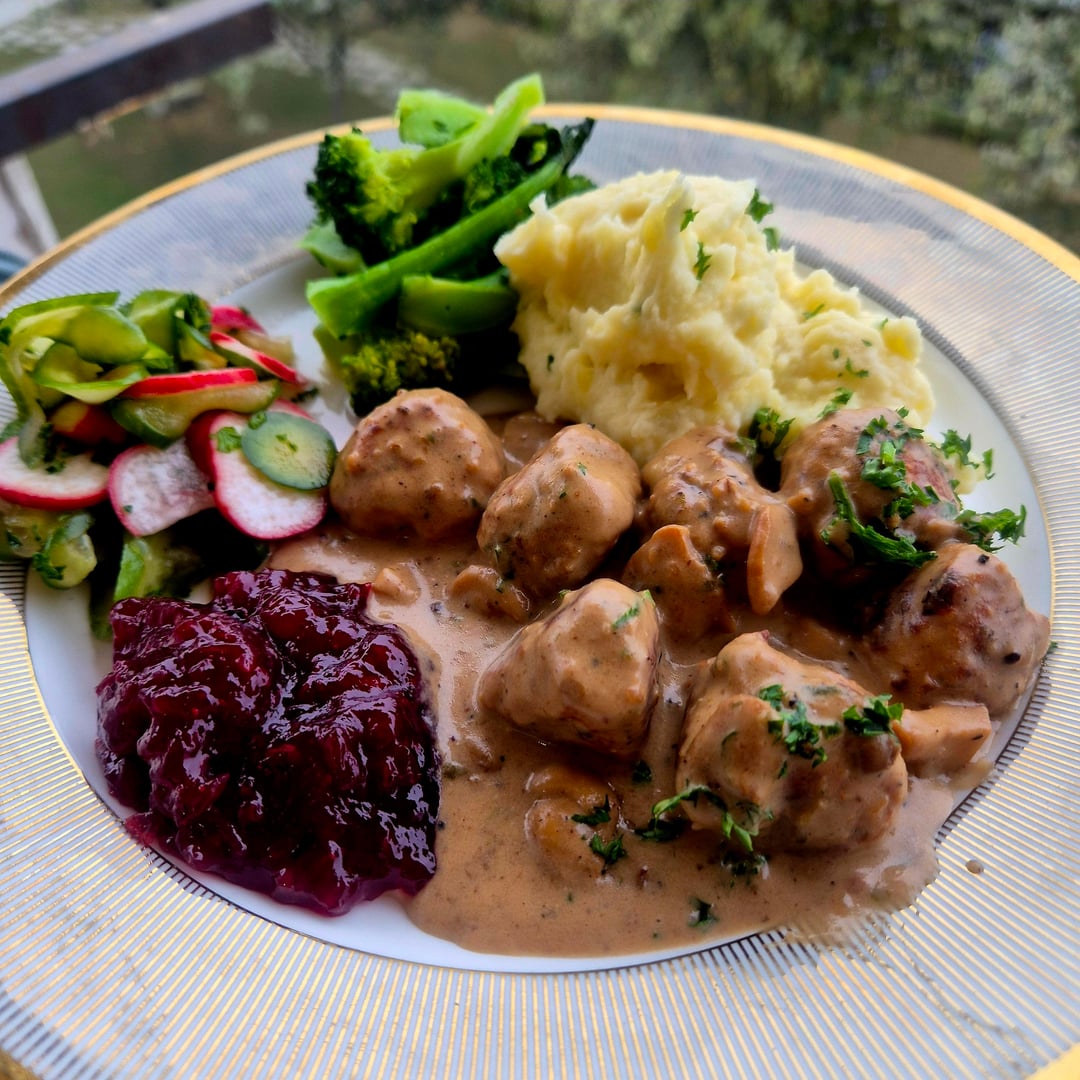 Mushroom cream sauce, mashed potatoes, buttered broccoli, quick pickled cucumbers and lingonberry jam.