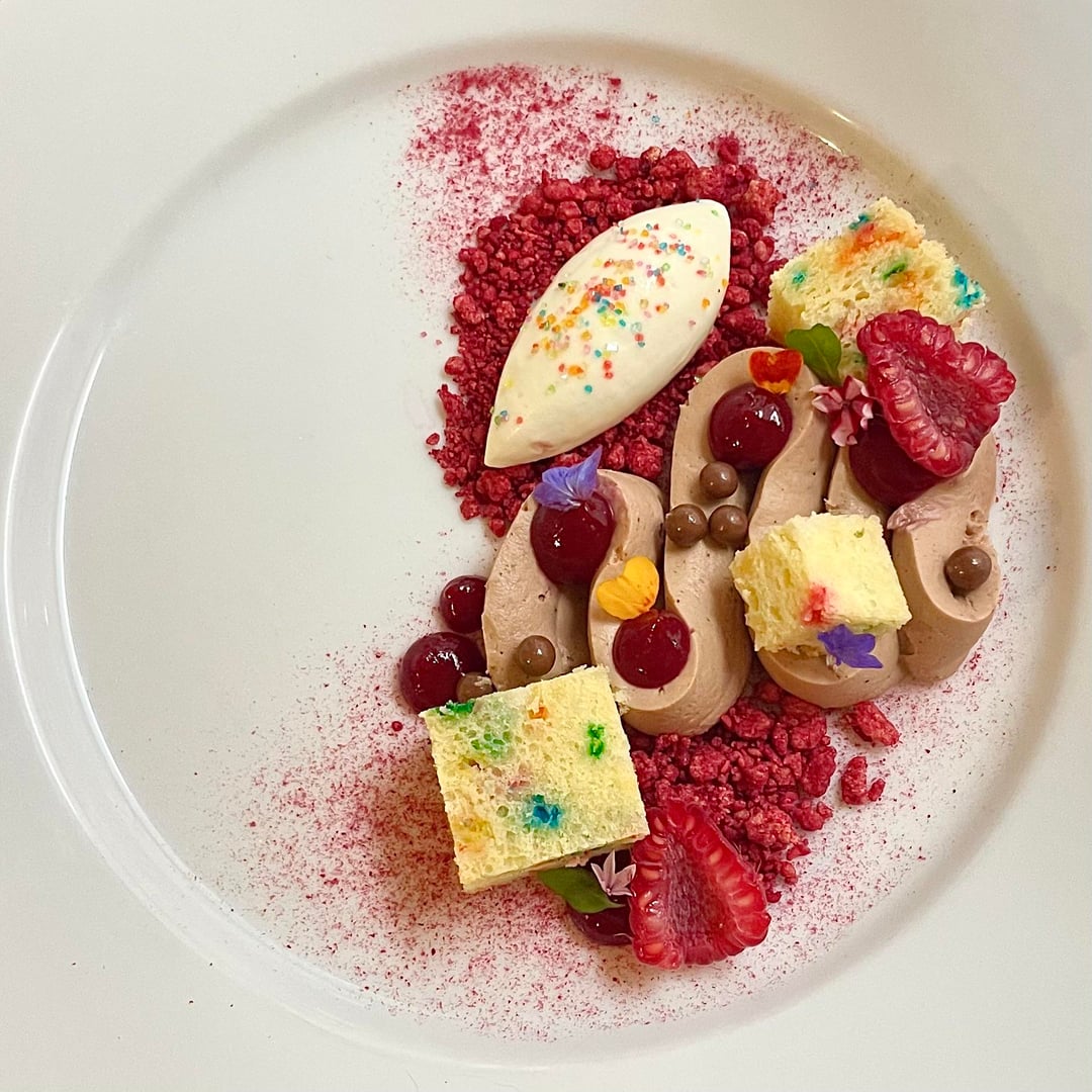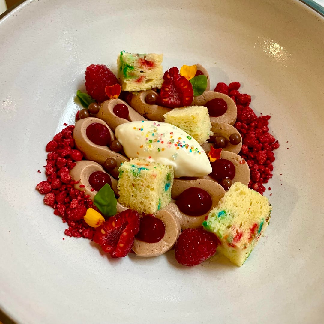 Buttermilk + olive oil chiffon, milk chocolate + blood orange mousse, buttermilk ice cream, raspberry + blood orange gel, raspberry milk crumb, milk chocolate pearls