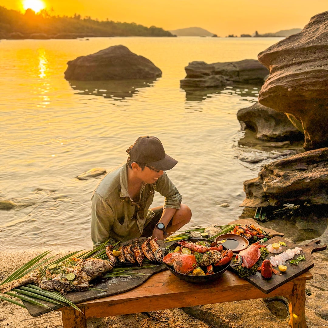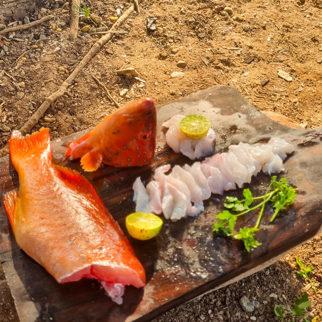 A seafood feast at sunset before New Year. Mangrove snapper grilled with chilli sauce, giant prawns with Thai hot paste, Cajun mudcrab pot with baked potato and corn, sashimi coral trout and roasted vegetables.