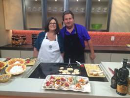 George and Linda Meyers (owners of Cook in Tuscany) of Haymarket, VA making Tuscan summer fruit crostini on FOX 5 DC for National Culinary Arts Month