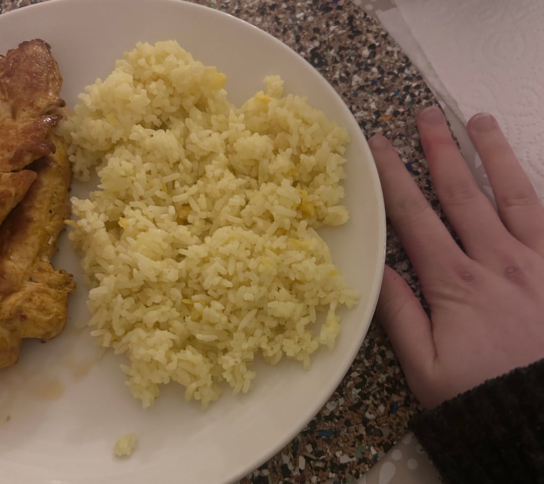 hi guys !! this is from a thai restaurant that didn’t have any cal info on the menu 😓😓 tap into image to see my hand for ref sorry for bad pic + ugly hand lol anyway i had around 1/3 of the tub of rice w bits of egg and there was only 3 skewers in the box !!