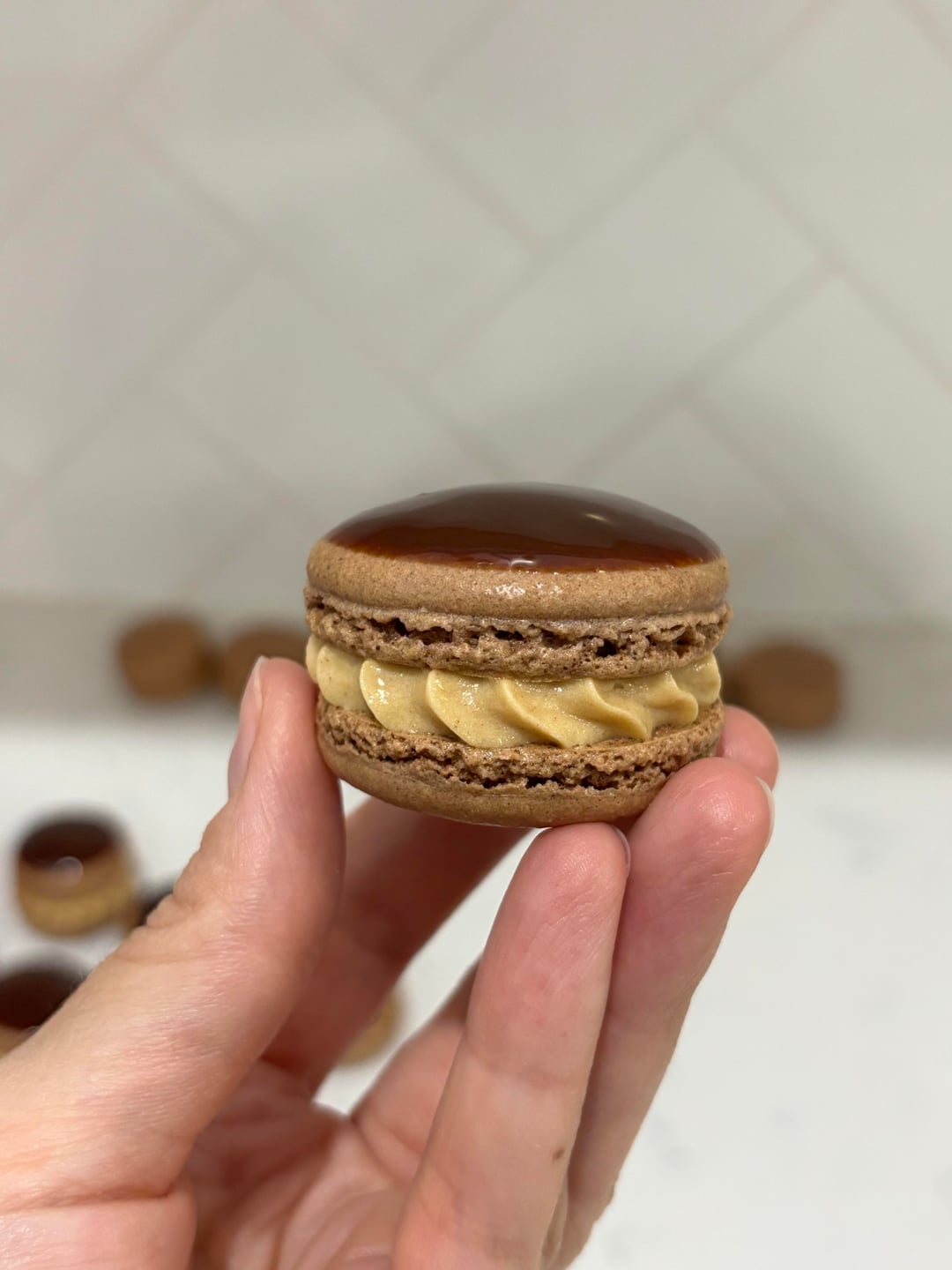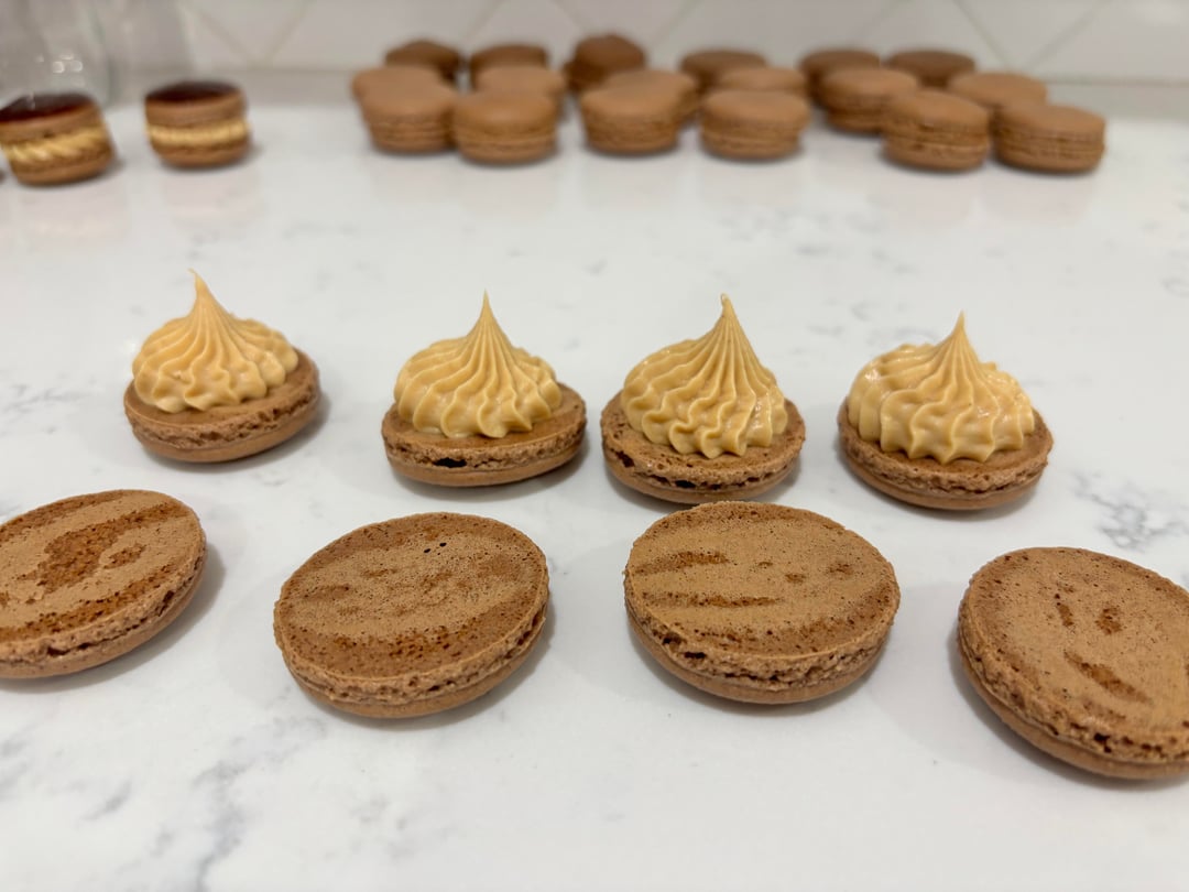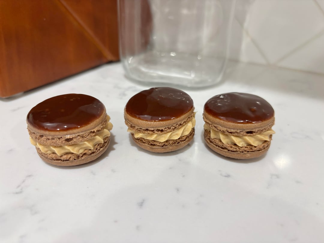 I went for chocolate shells with a chocolate ganache and peanut butter buttercream filling. I definitely still have some work to do on the baking of the shells, I wasn't expecting the cocoa powder to slow down the baking process so much!