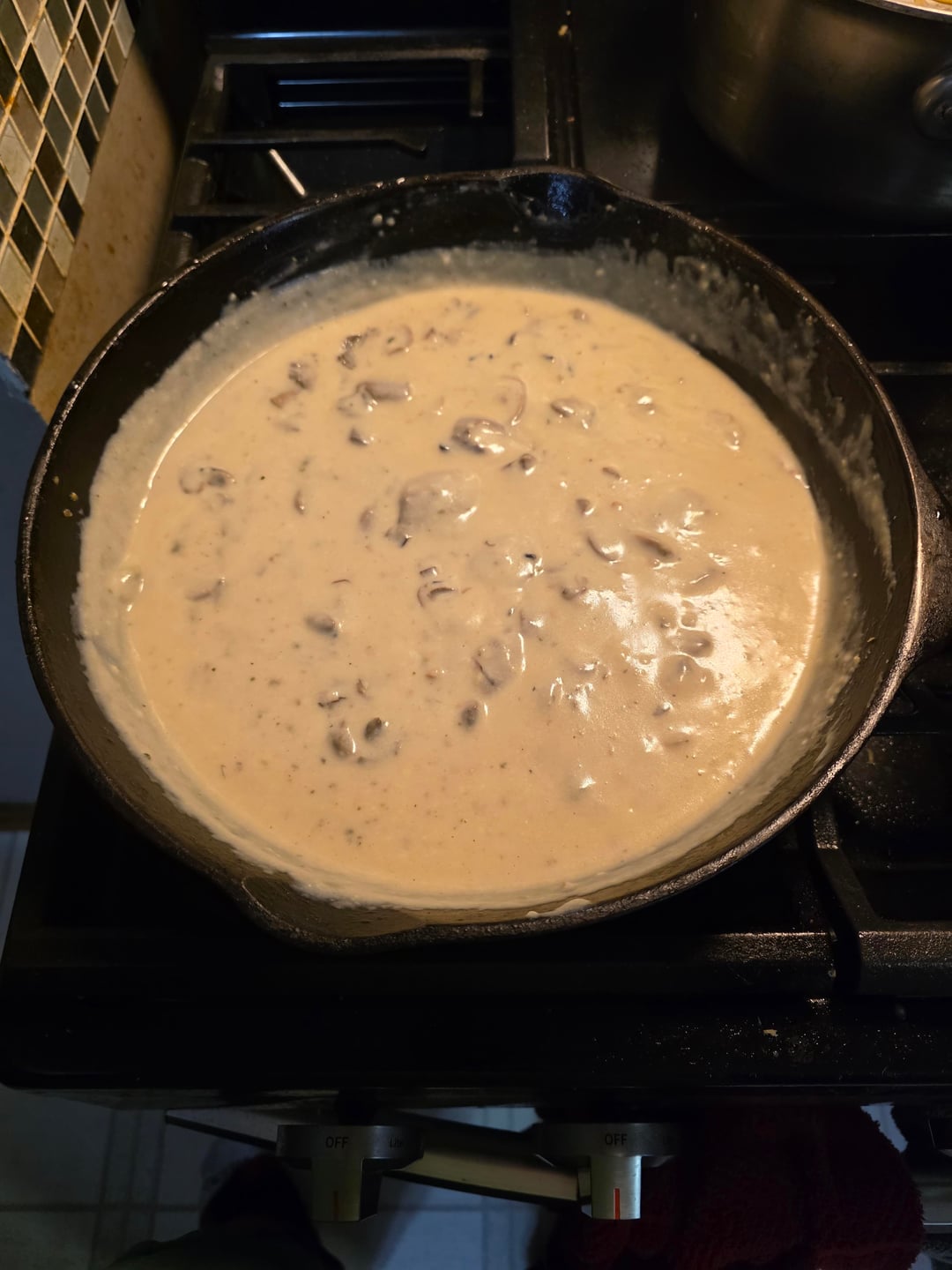 Garlic, mushrooms, and oysters in my Wagner #10 cast iron, then I added a can of condensed cream of mushroom soup, some milk, and a lot of parmesan cheese. Used spaghetti noodles because that's what I got
