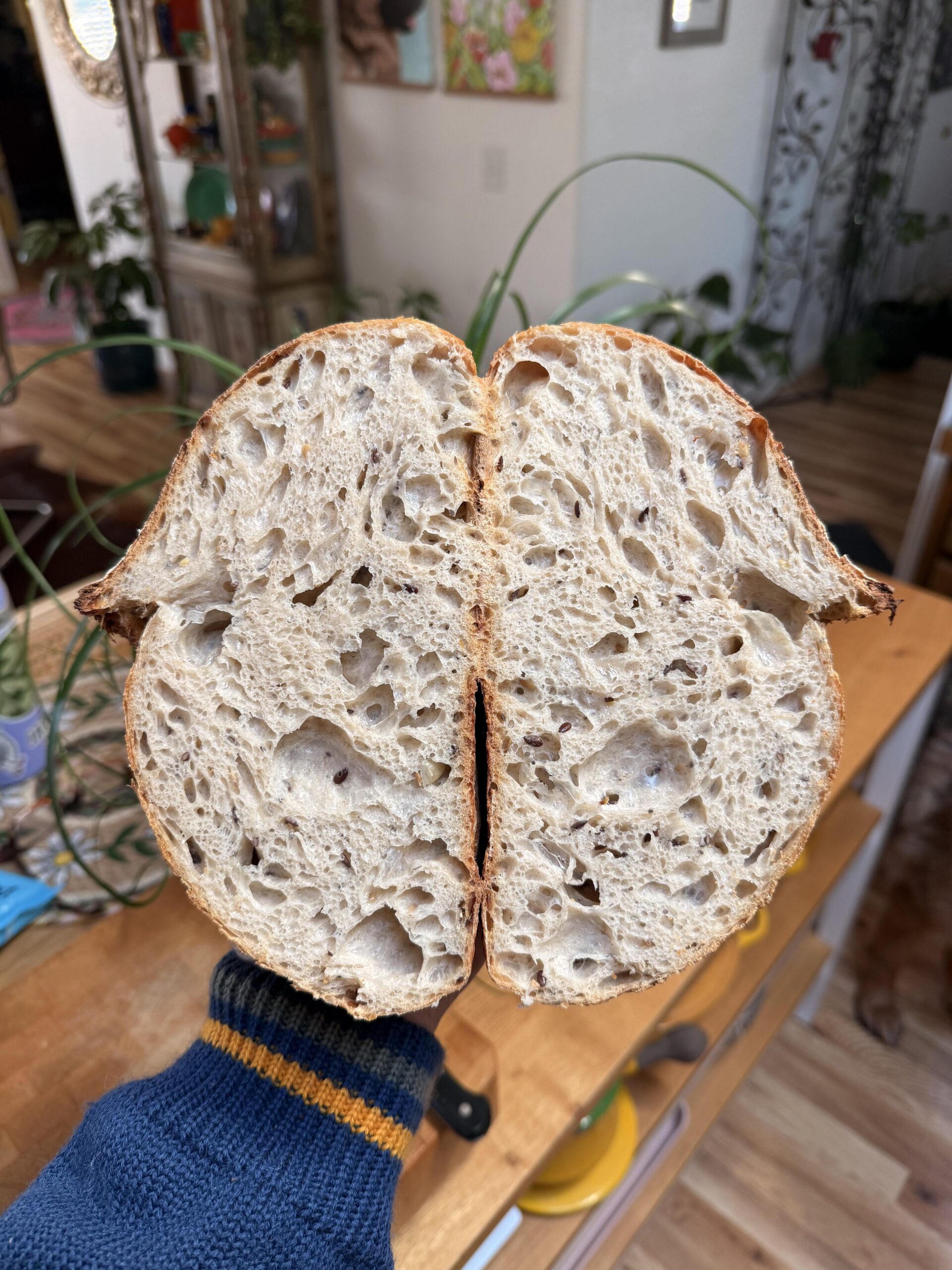 Mix starter and water, then add flours. Wait 1 hour and add salt with splash of water to help incorporate. Add seeds with first set of stretch and folds. 3 sets 1 hour apart. Bulked for about 10 hours (my house is super winter cold). Shape and rest in fridge overnight. Scored and baked in 450 preheated dutch oven covered with ice added for 20 mins, then at 400 for 40 mins uncovered.