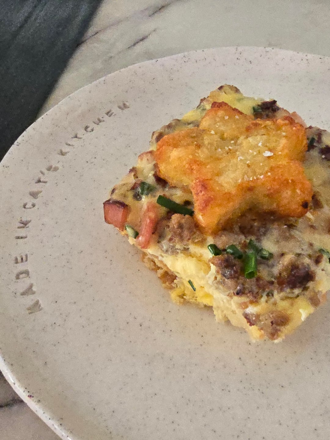 Hash browns, bacon, homemade turkey breakfast sausage, cheese, eggs, hash brown stars