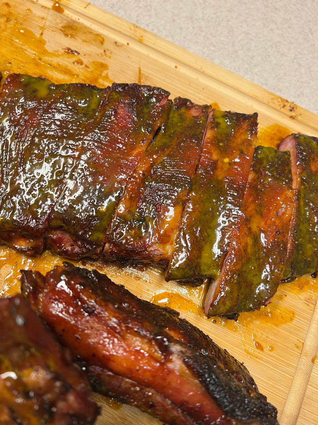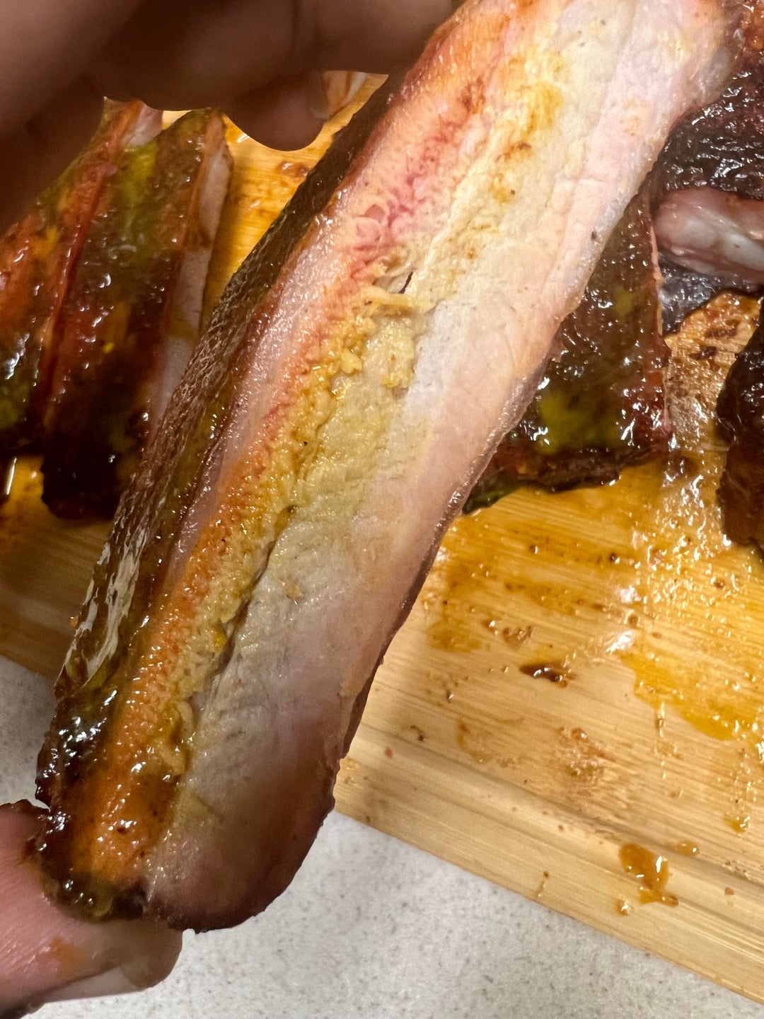 Here’s my unsolicited take. Did you pull the membrane? I only ask bc it’s hard to tell from the angles and color permeated differently.