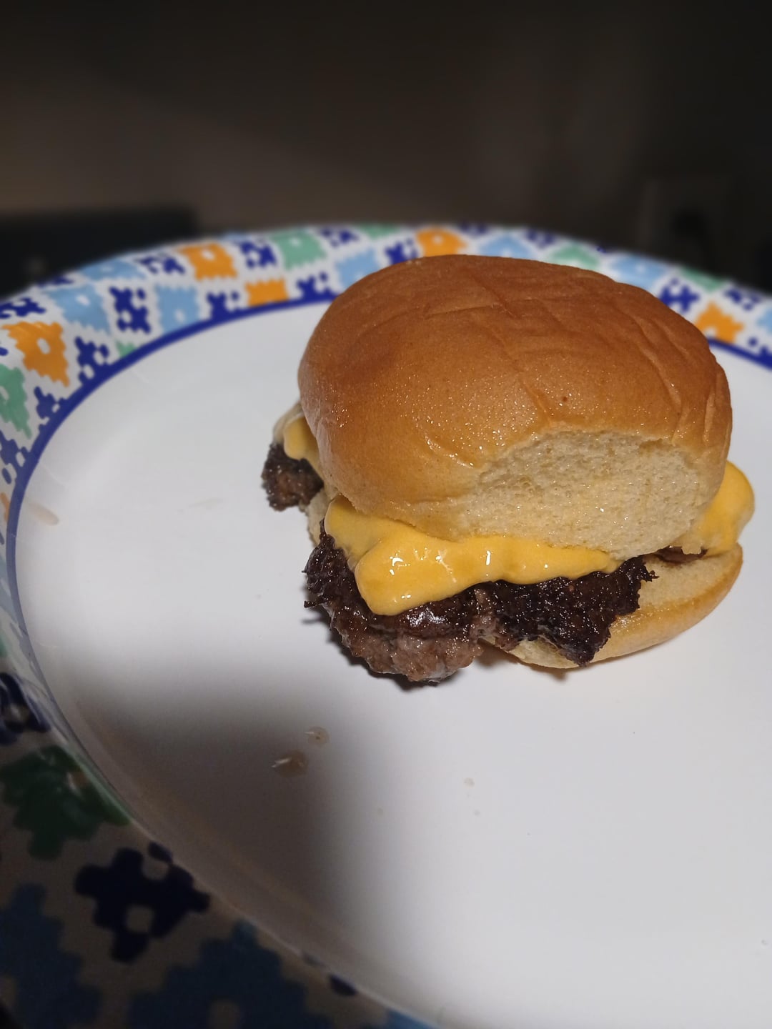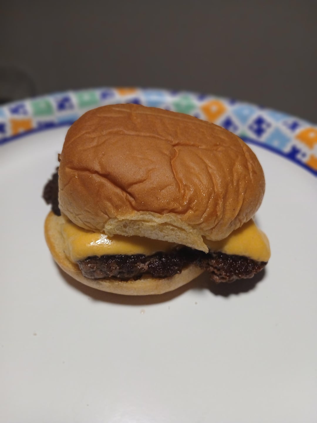 A good-looking bun, perfectly cooked patty, well melted, plain American cheese… simple perfection.