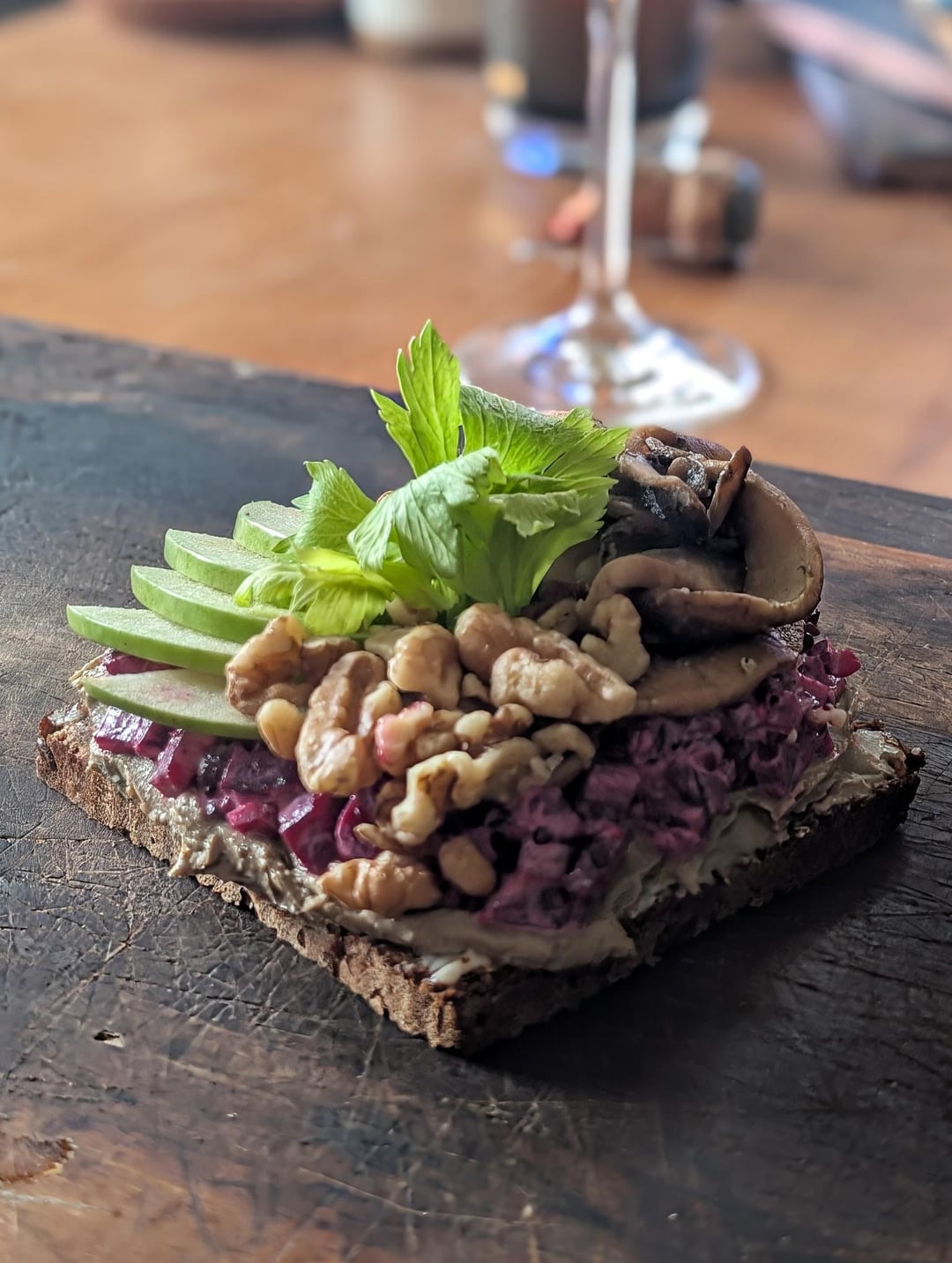 chicken liver pâté, beet tartare, mushroom, granny smith, walnut, celery leaf