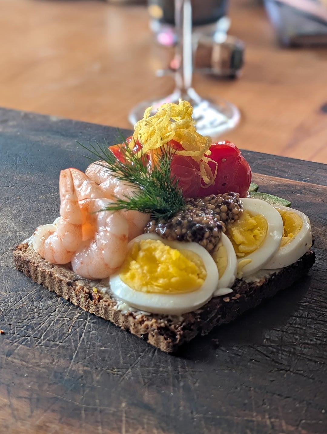 shrimp, egg, avocado, pickled tomato, mustard, dill, lemon zest