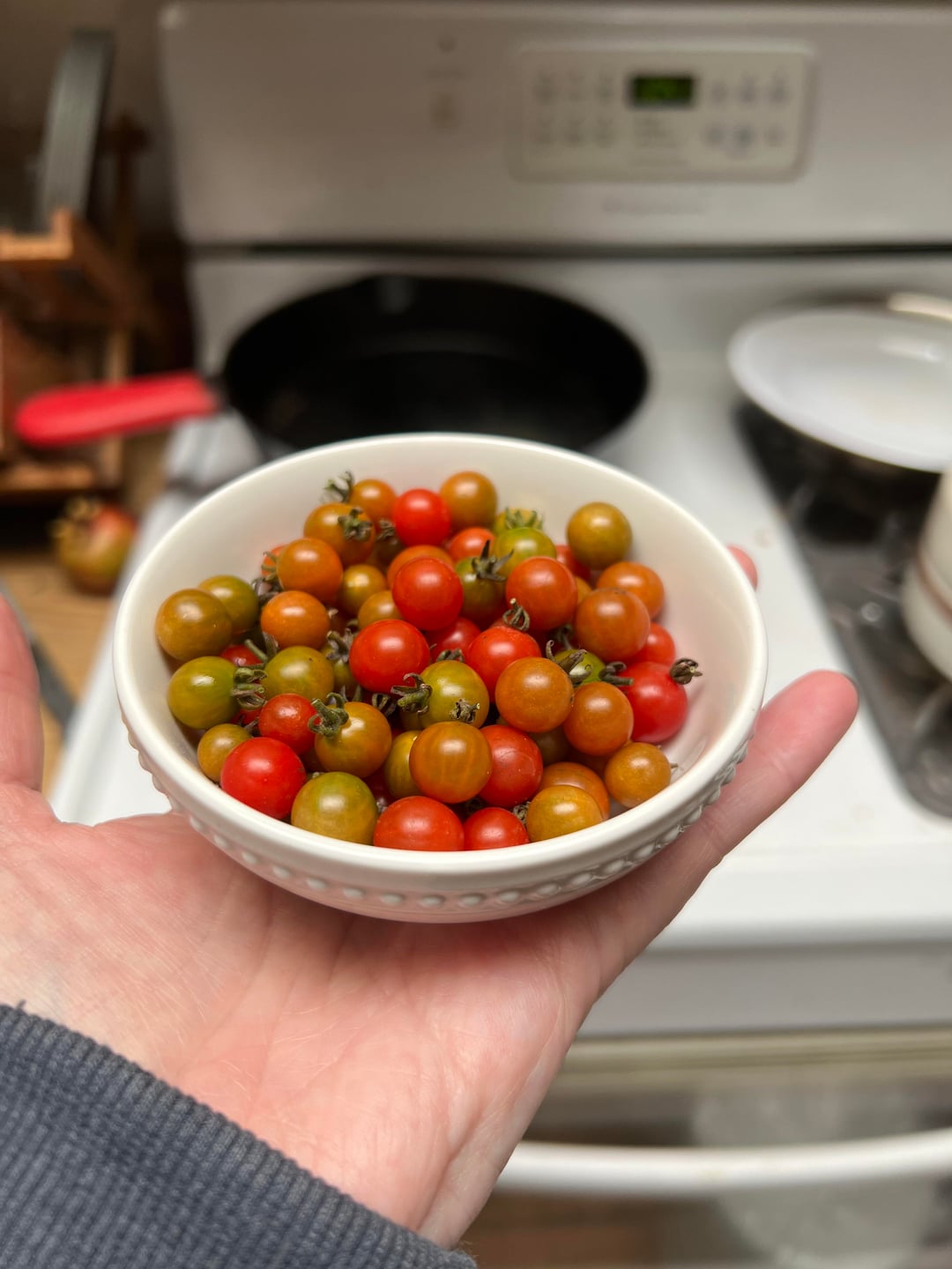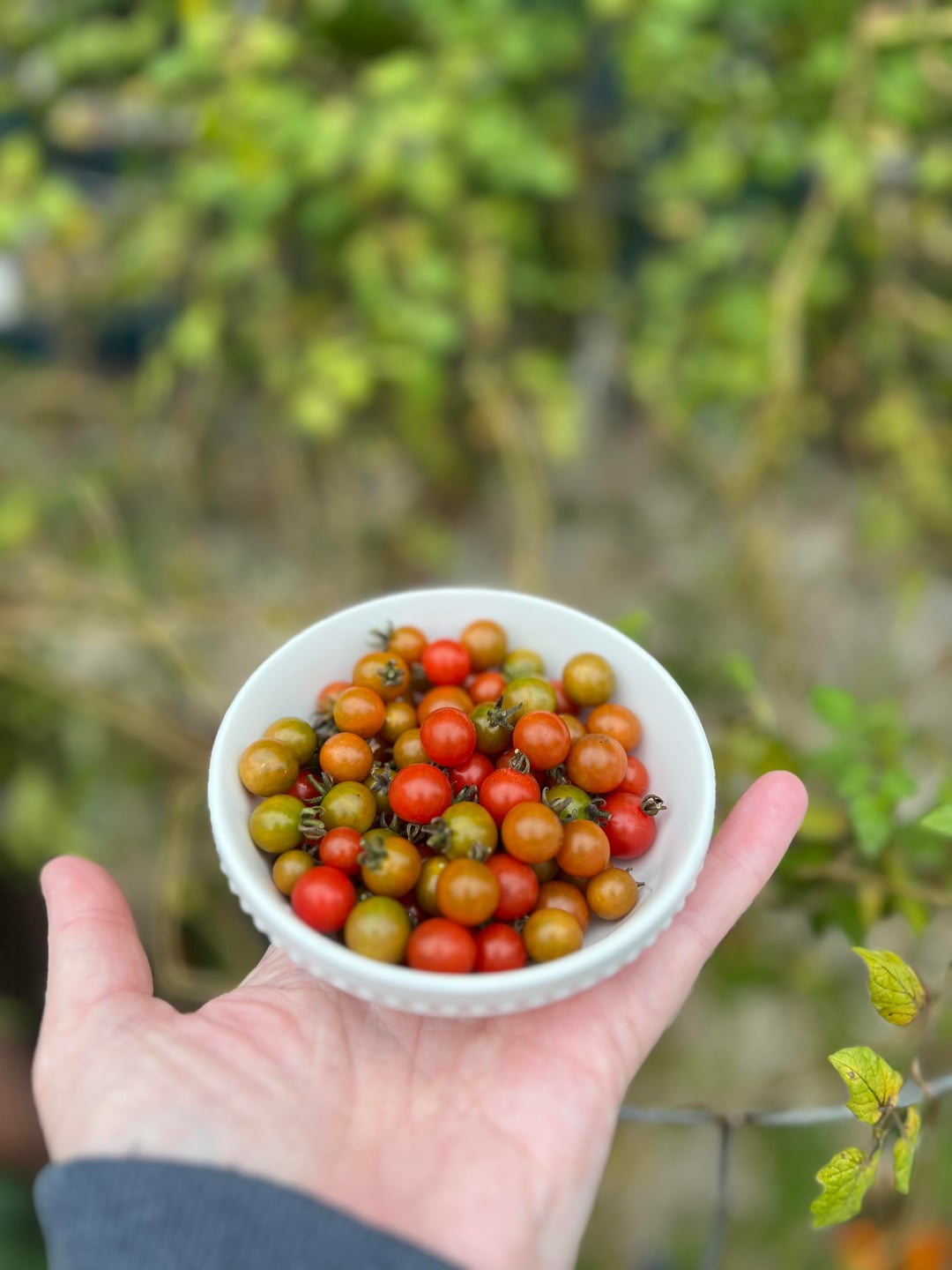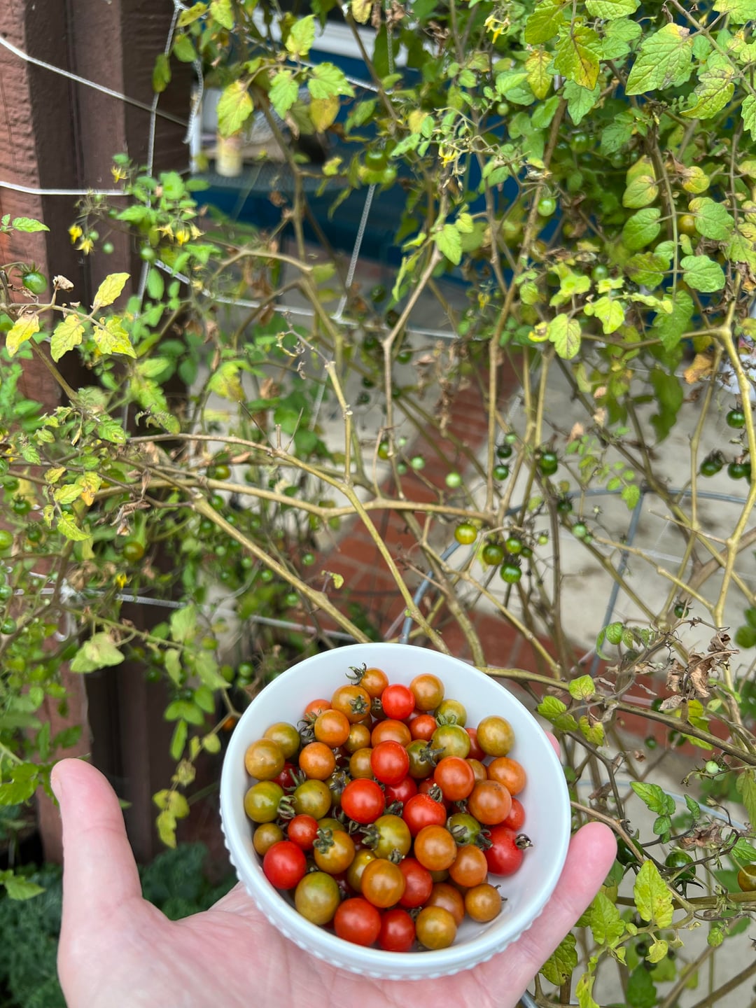 Got the tiny tomatoes advertised by Bakers. The vines are all over the place, and picking these raisin sized tomatoes is very time consuming – but if you like to harvest things, these are lit 🔥❤️. They make the cutest salads. Very sweet, they’re like tomato caviar 😂.