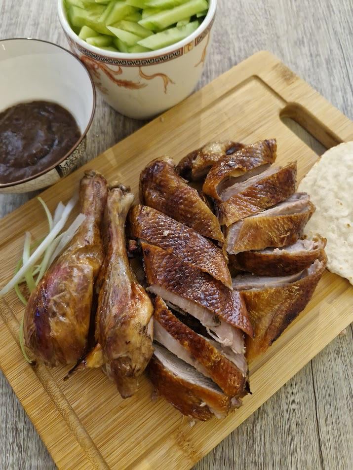Hello all, this is my version of roast duck at home. First time making the duck pancake which is not thin enough, I will do better next time!