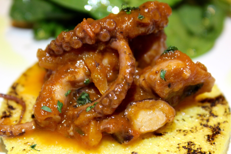 Octopus cichetti, a classic Venetian side dish, is small and savory on top of grilled polenta. Credit: Laura MulrooneyA favorite starter of Leonardo’s is the cicchetti alla Veneziana. The co-owner says Venice has a tradition of cicchetti (pronounced chi-KET-tee) — savory small dishes that change regularly and are akin to Spanish tapas. In Venice, these morsels line the counters of pubs all over town at the end of each workday, when locals wash them down with conversation, laughter, prosecco and wine.