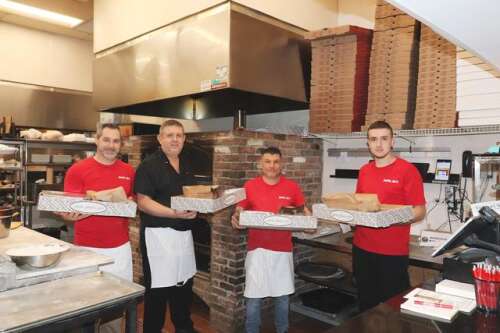The staff of Papa Al’s Pizza Pasta Subs provided nearly 30 full meals to local families on Christmas Eve, free of charge. Standing in front of the brick oven that has cooked up countless meals since the restaurant opened in 2012 are, from left, Owner Fiat Islami, Chef Dritan Hodja, and employees Rino Ricci and Erion Hodja. —Bee Photo, Hicks