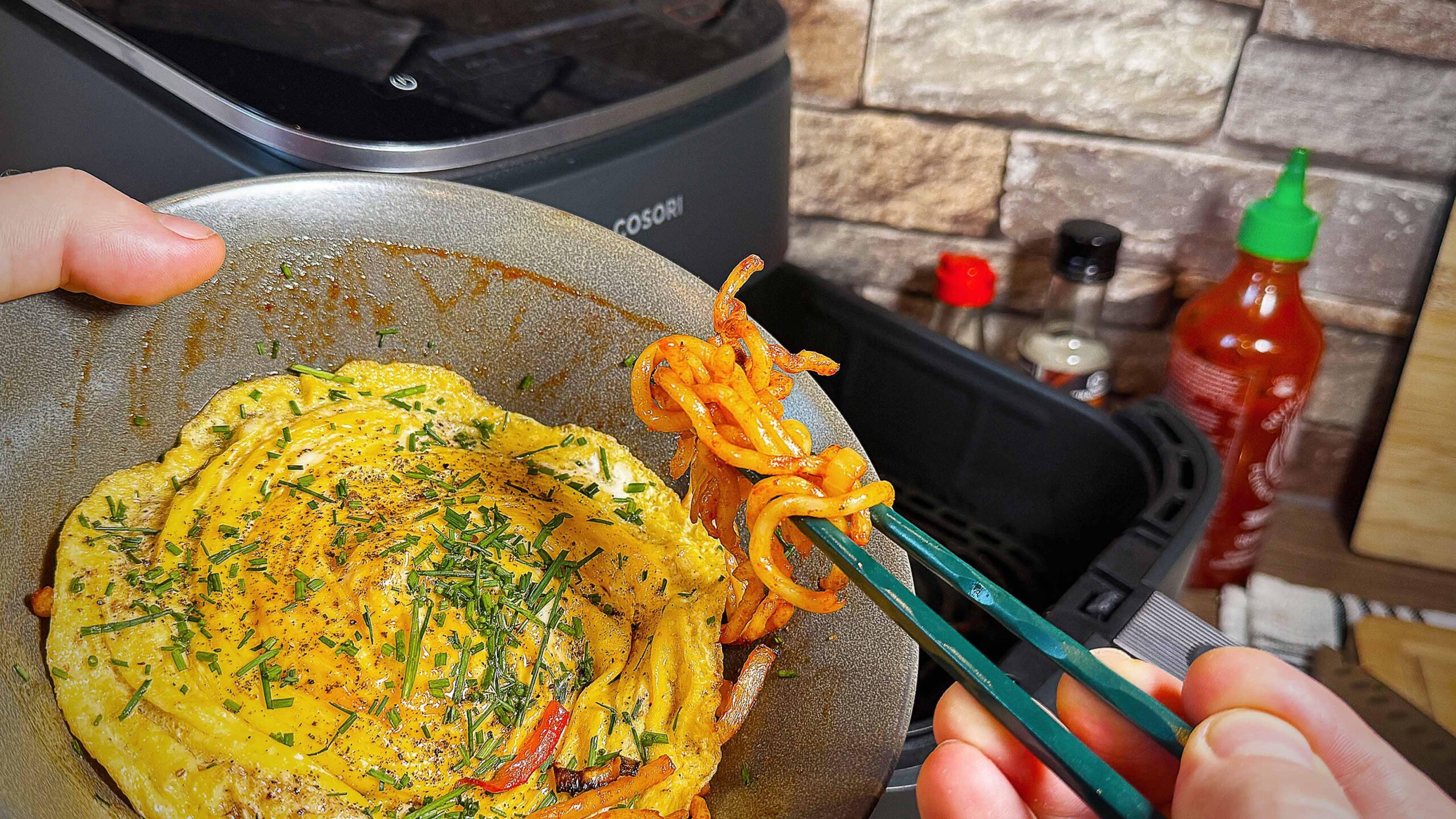 I made myself a little noodle stir‑fry in the air fryer. Technically, you probably can’t call it a “stir‑fry” anymore since there wasn’t an actual pan involved… but who cares. It tasted great, and I even managed to pull off the tornado egg :).
