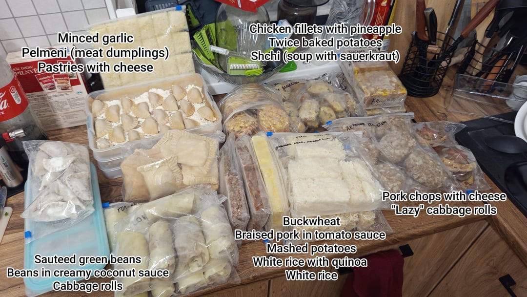 Context: my grandma suffered a bombastic combo of a stroke and epileptic seizure back in October and is now bedridden. Mom and dad stepped up as caretakers, and at first it caused them to sustain themselves primarily on sandwiches and take-out. So I stepped up to be the chef and the meal prepper when I am visiting, providing meals that can be either easily microwaved, baked or sauteed without much additional energy input. Been staying over since Christmas and slowly building up the stash. Everything was done before the New Years, so I can officially joke about all this being last year food.