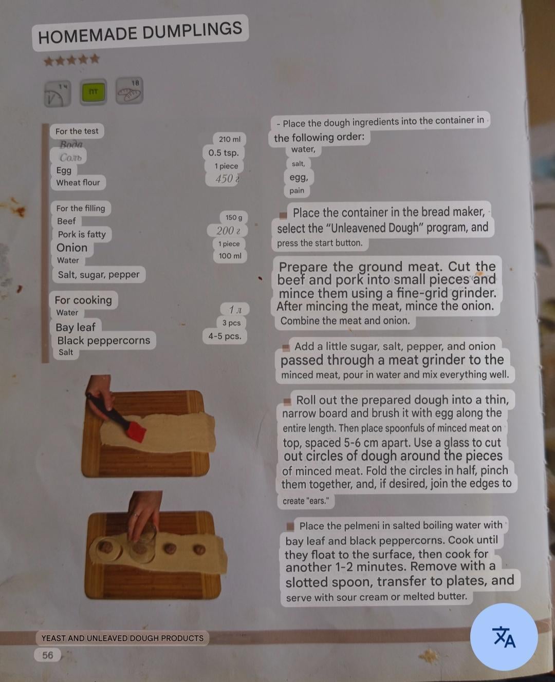 • Pelmeni aka meat dumplings. Added the recipe from the book grandma used, but we skip water and sugar in the filling and add garlic during mincing. The dough turns out quite moist. I tend to add like 10-20 more grams of flour before mixing and generously dusting it with more while rolling it out. I use a special tool to make these, so I don't brush the entire sheet of the dough with egg. Instead, I brush one side of the circle with water before forming. To not waste the sheet with holes cut out, I roll it into a ball, add a tiny touch of water (to counteract the flour added during first rolling), knead it a tiny bit and leave it under plastic while working with the rest of the dough. By the time I come back to it, it's nice and ready to roll out;