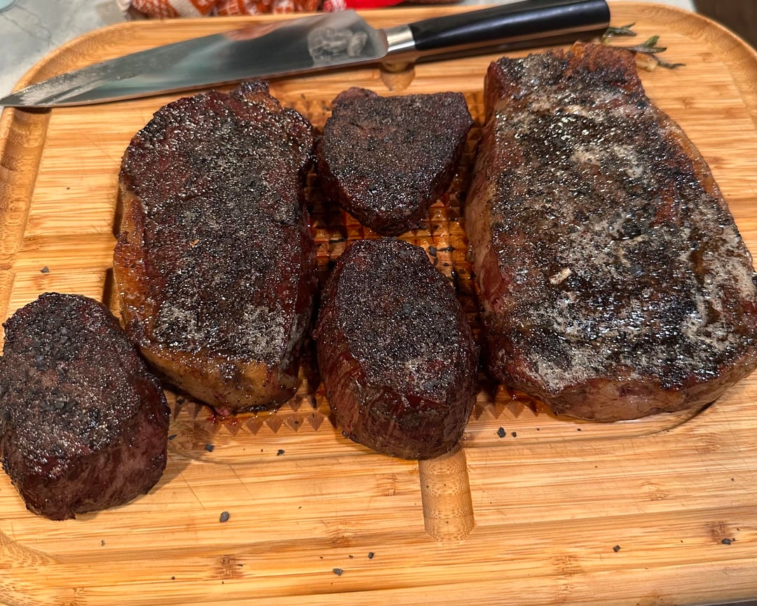 Decided to reverse sear a few different cuts for NYE. Dry aged ribeye on top, dry aged American wagyu strip in the middle and filet on the bottom. Best steaks I made all year.