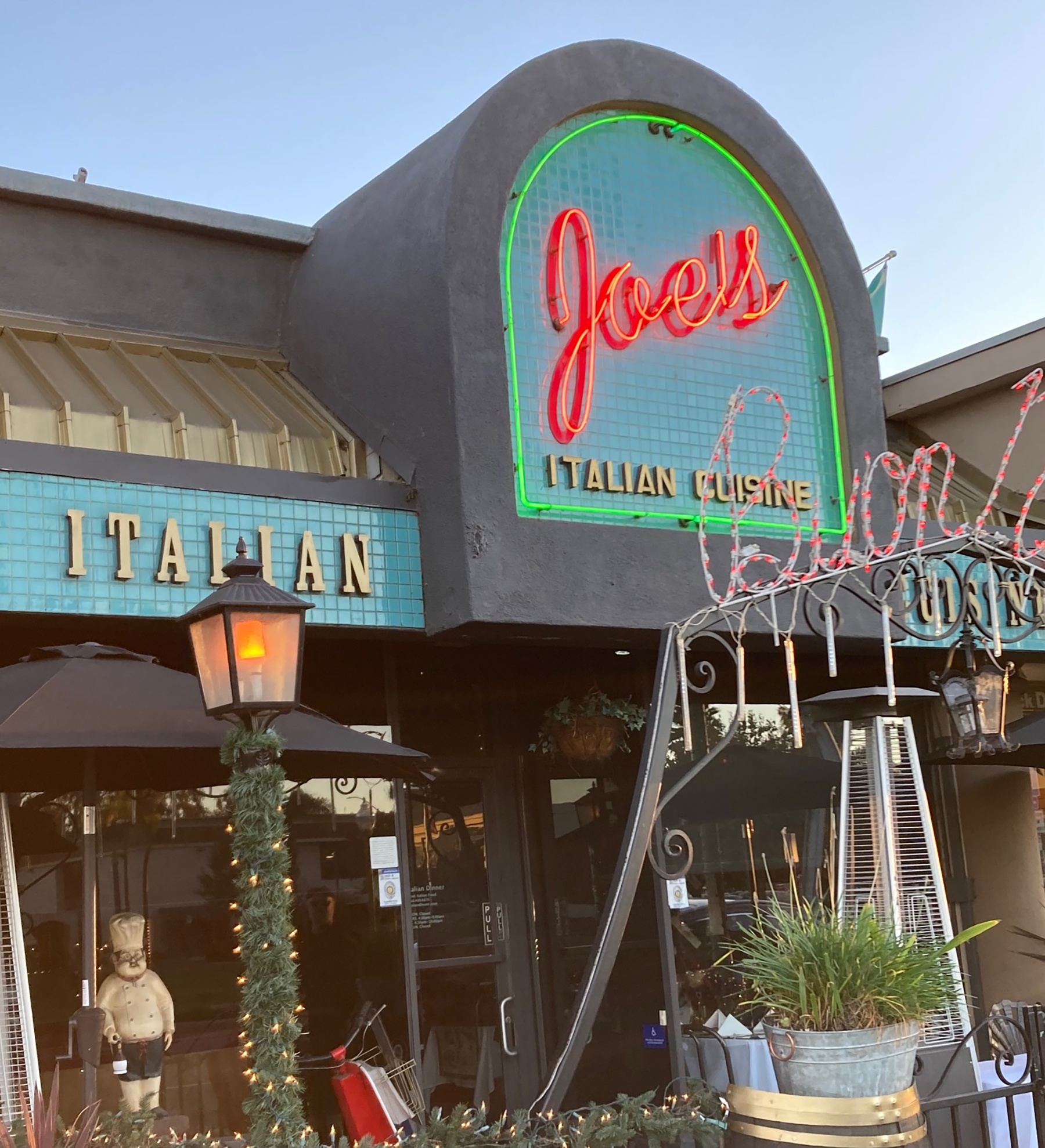 The interior of Joe’s Italian, decorated for the holidays.