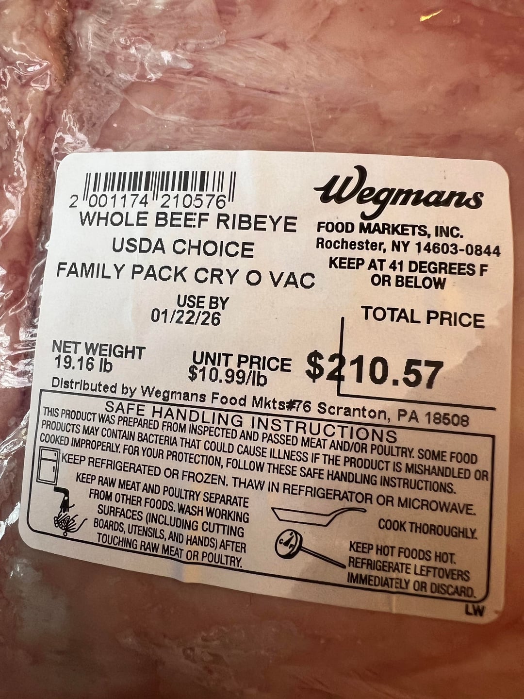 19 lb boneless ribeye for 10.99 a lb. Couldn’t believe I found this deal at wegmans, was beautiful when I cut her open as well! After trim got probably an 8 lb. Roast and four 2 lb steaks.