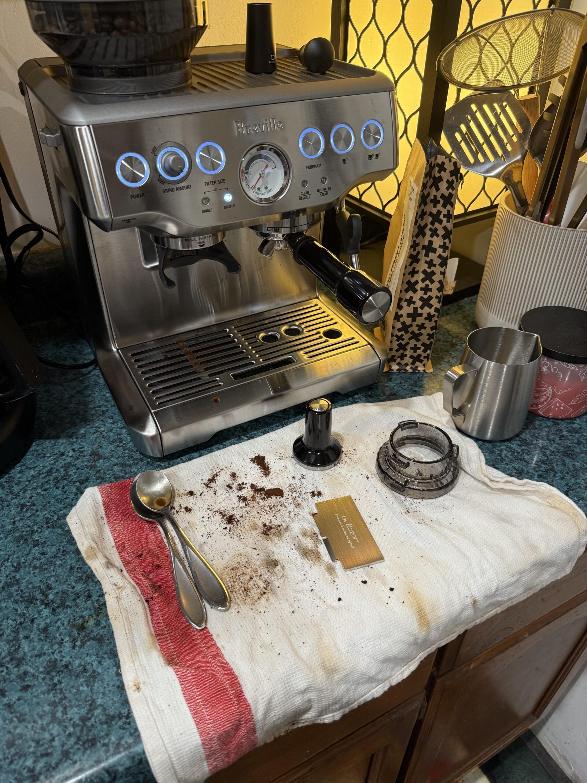 I received a Breville Barista Express for Christmas! I enjoyed every minute of dialing it in. (As you can tell by the messy station 😂) Followed the dialing in instructions from the sub and bought freshly roasted beans from a local roaster as suggested. Was able to reach the ratio and taste I wanted. This sub is a godsend. Happy New Year everyone!