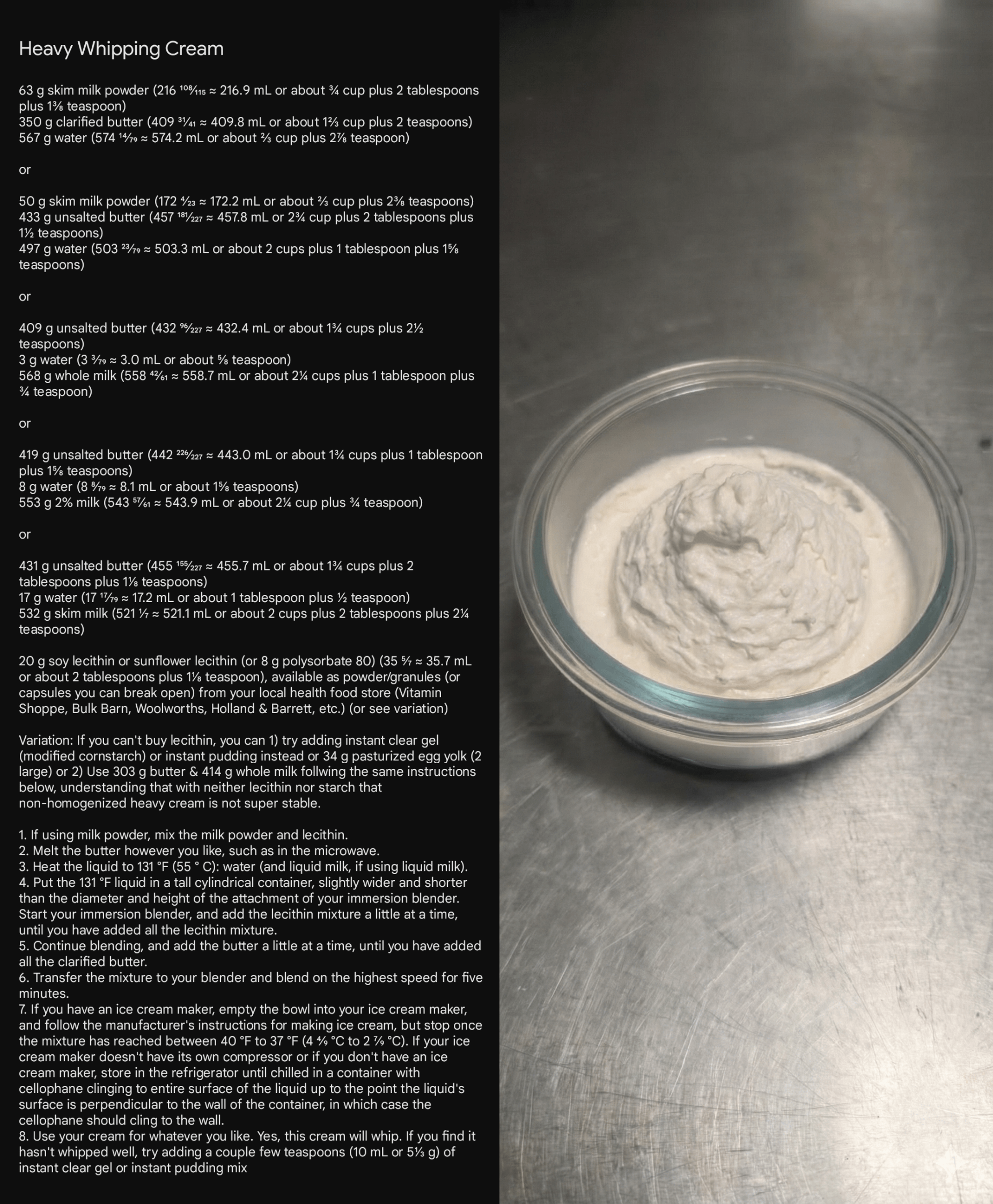 The stores near me were frustratingly constantly out of heavy whipping cream, so I decided to make my own! You really do need a pretty powerful blender for the fat globules to become small enough for whipping. Unfortunately, industrial homogenizers simply aren’t available for home kitchens, so if you struggle to get it to whip, some instant clear gel or instant pudding mix comes in really handy.