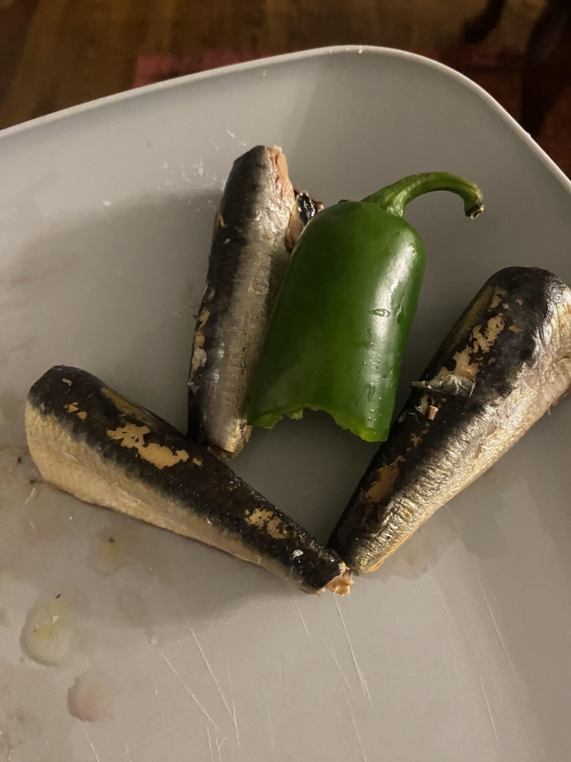 I just got an idea…. What if we hollowed the seeds out of the jalapeño, and put an entire sardine INSIDE the pepper? I feel like a decent sprat would fit up in there really well. Jalapeños being sardine shaped might not be a coincidence, but nature trying to tell us something. Maybe toast it under a broiler for a minute and serve up on an appetizer tray?