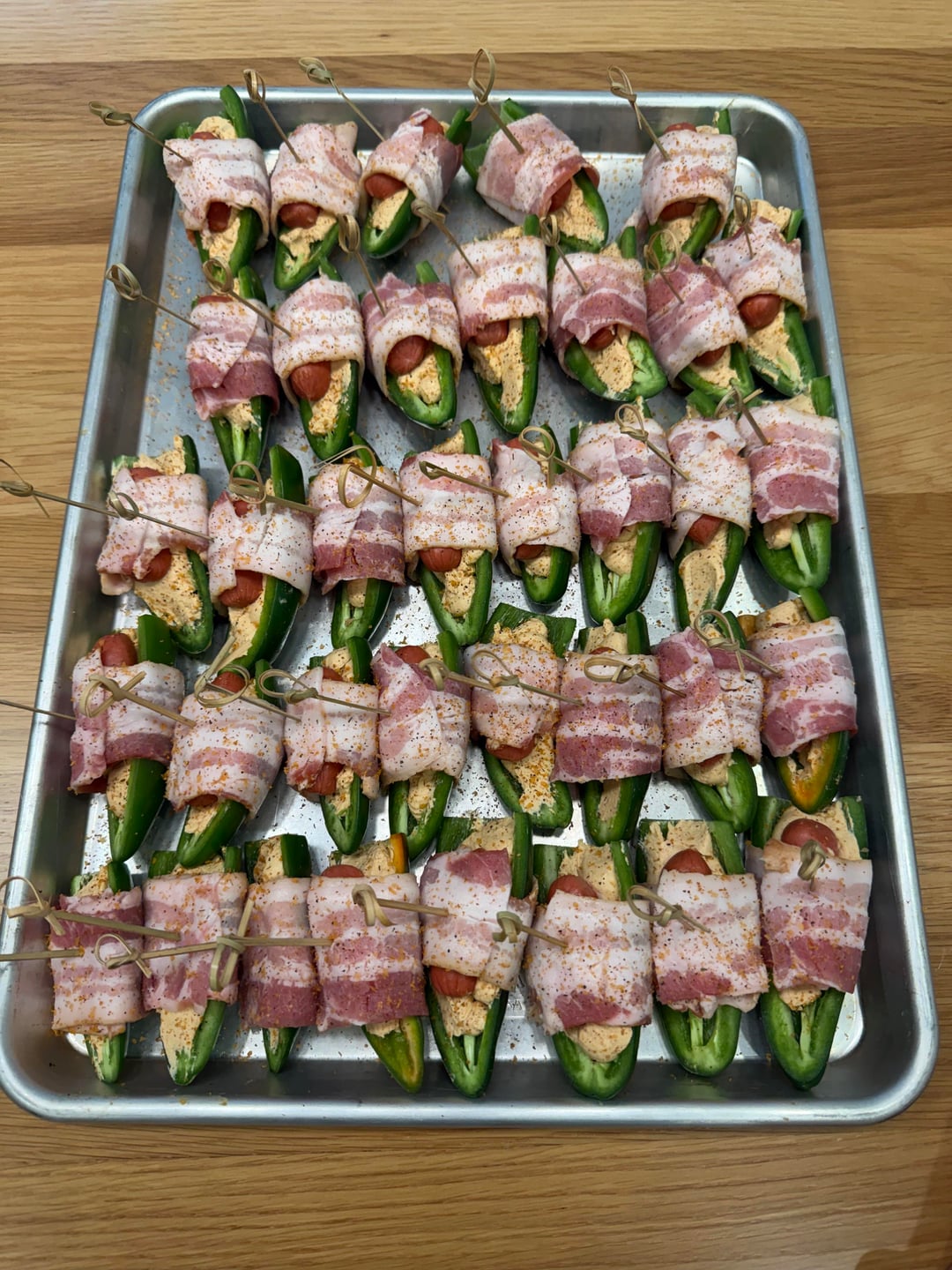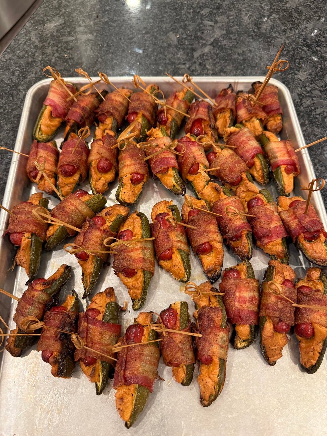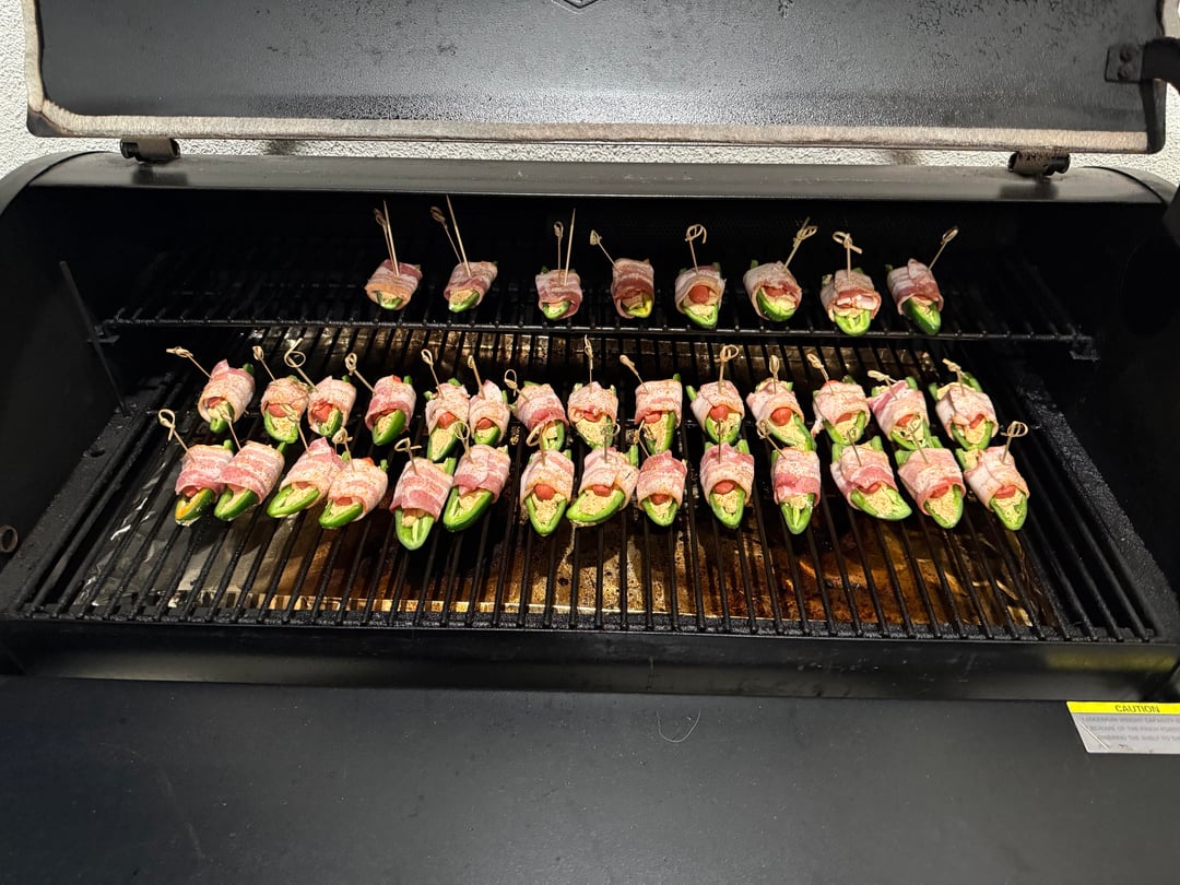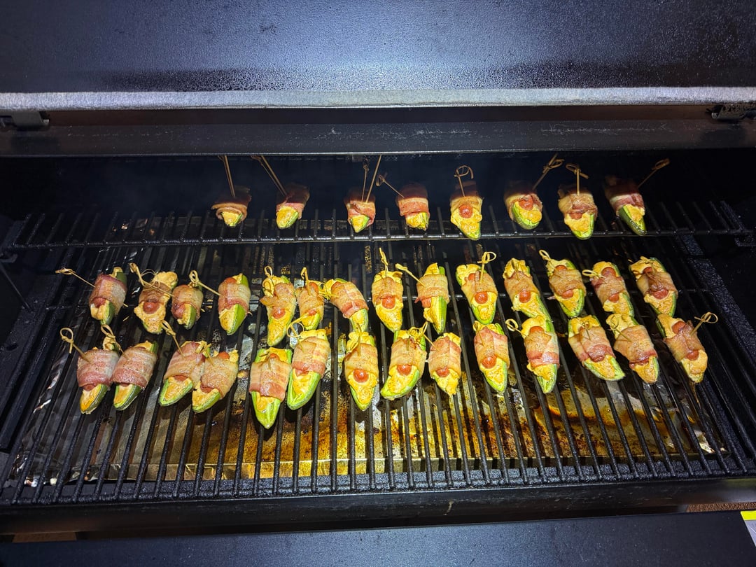 These are jalapeños cut length wise and filled with a cream cheese that has habanero, garlic and cayenne pepper mixed in, you add a lil smoky hot dog and wrap in bacon. Lightly sprinkle your favorite sweet tub over the top. Smoke at 300f for about an hour or till bacon is cooked.
