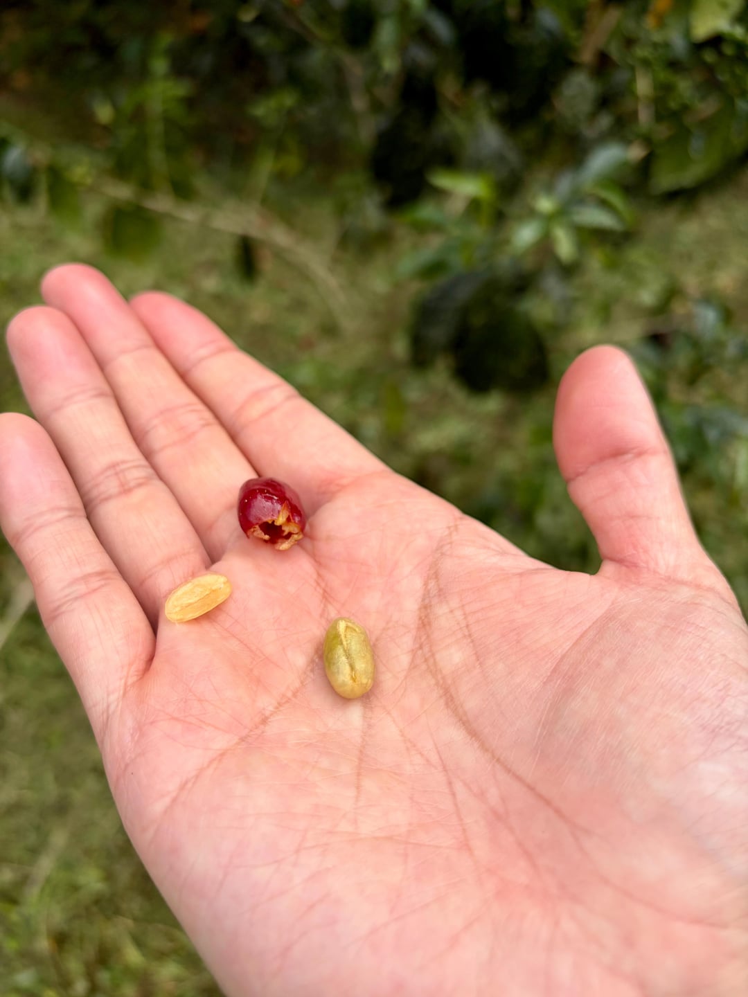 Photo 7: I plucked a coffee cherry and squeezed out the bean. I tasted the skin and mucilage and it was quite sweet, sticky, and tasty.